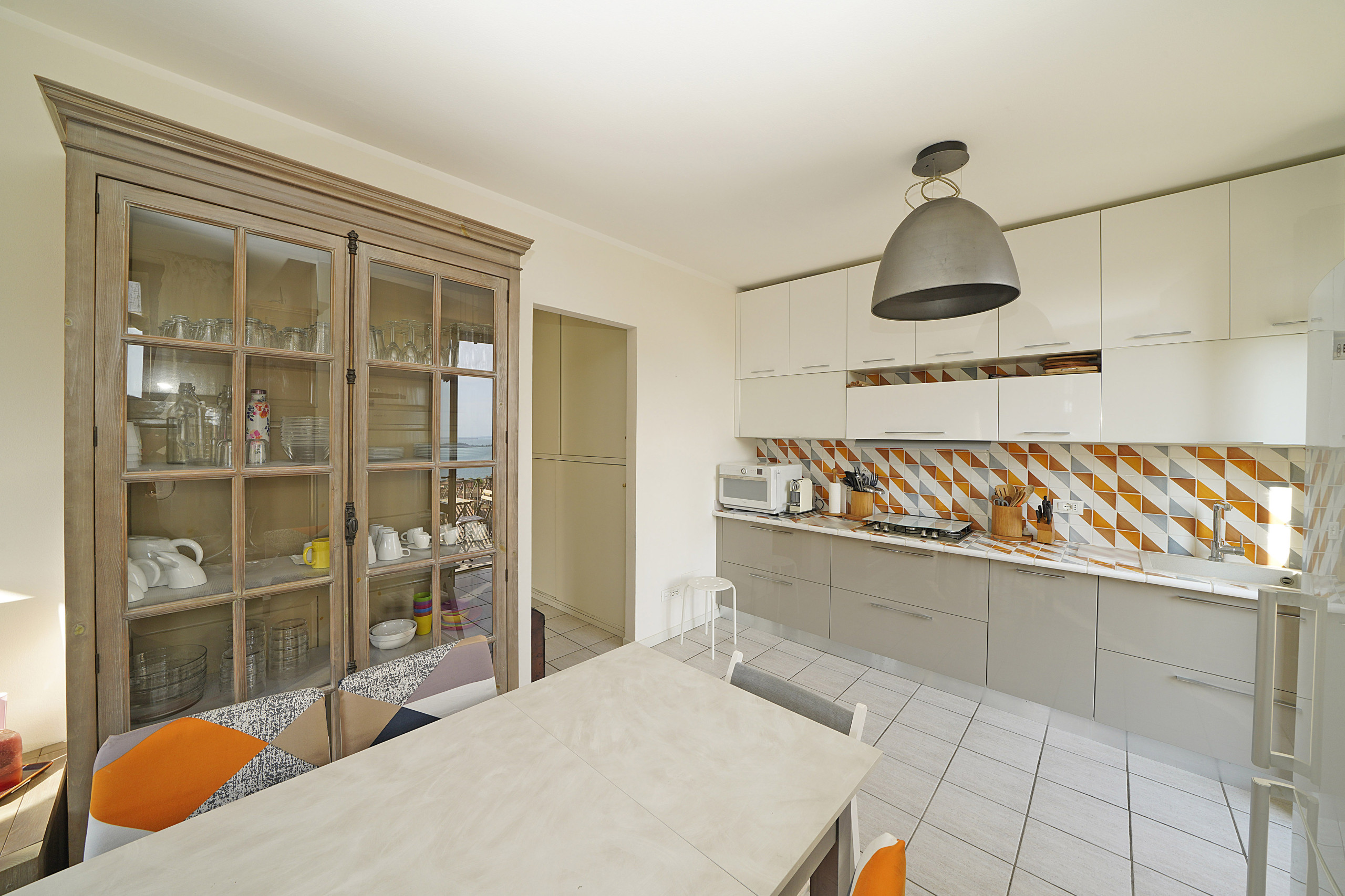 La cucina americana a gas è completamente attrezzata con frigorifero, congelatore, microonde, lavastoviglie, stoviglie e posate, utensili da cucina, tostapane, bollitore e spremiagrumi, ideale per sentirsi come a casa anche in vacanza.