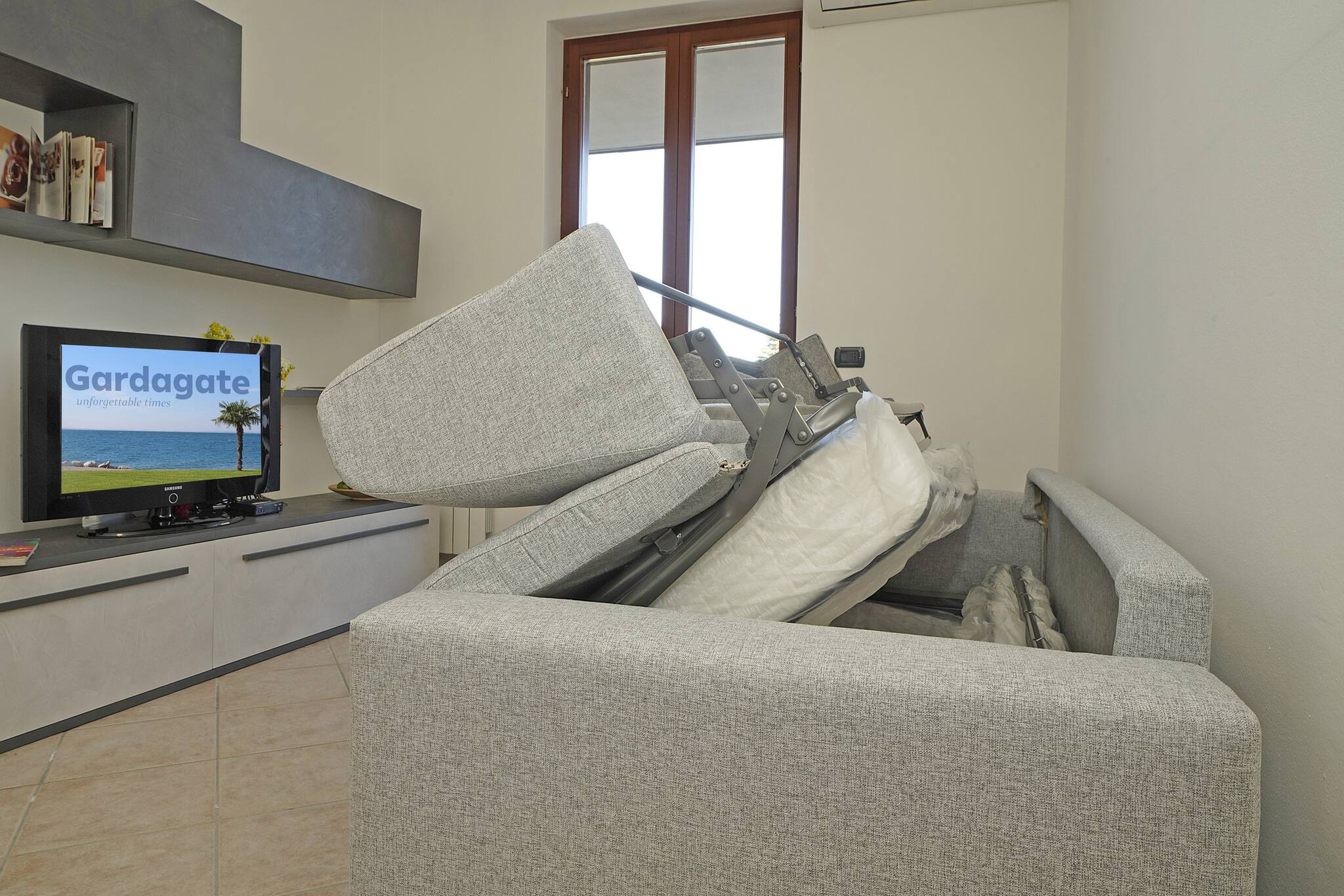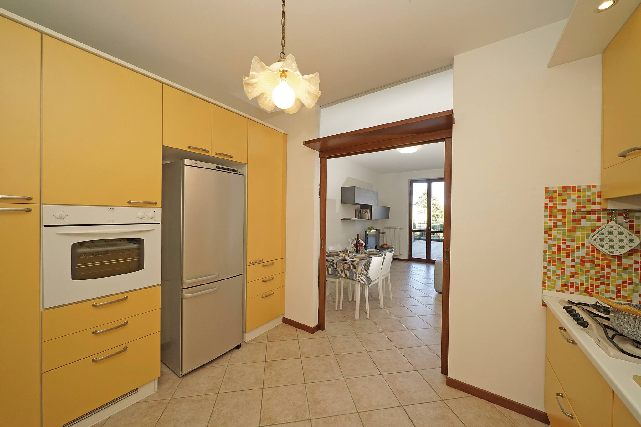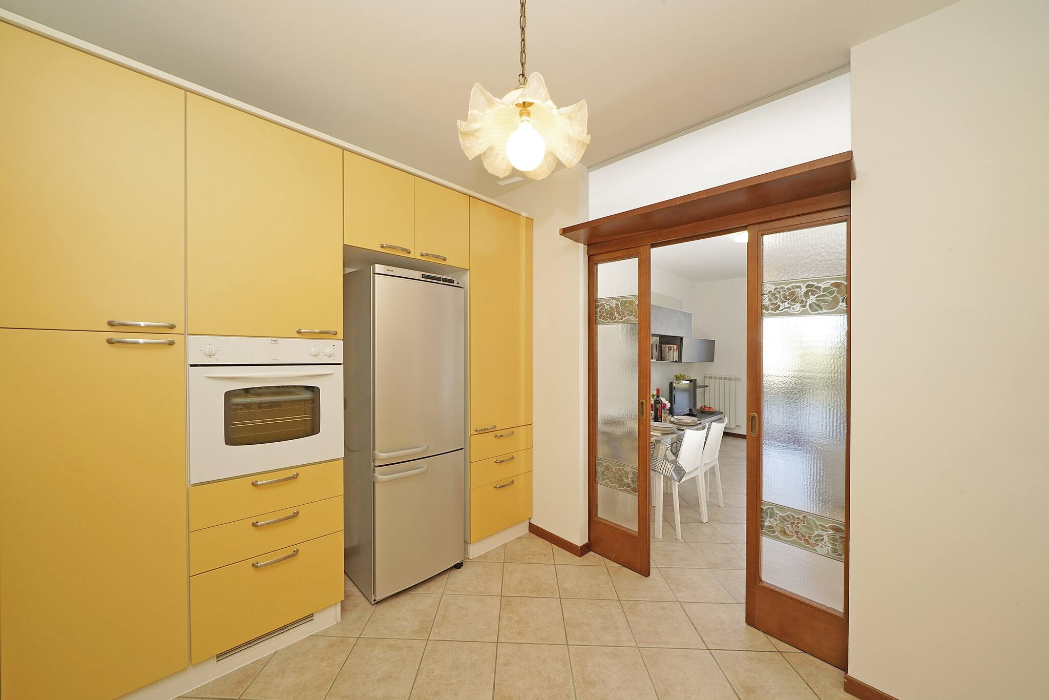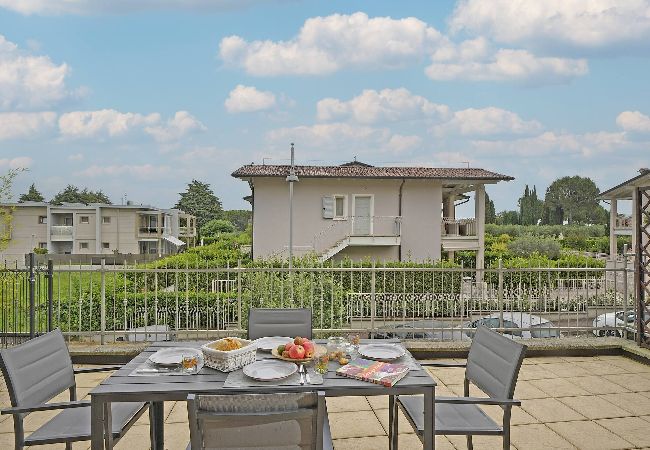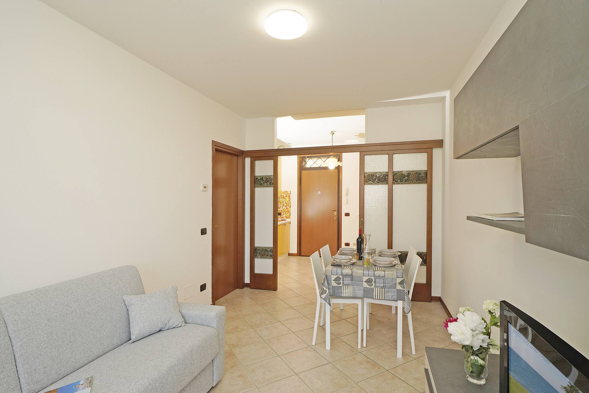 Con ingresso al piano terra, si accede subito all'ampia cucina completamente attrezzata separata da una porta scorrevole che fa accedere al luminoso soggiorno con divano letto, tv e tavolo da pranzo; la perla di questo appartamento è la terrazza, grande e spaziosa , ideale per cenare godendo della fresche sere estive lontano dai rumori del traffico. A destra della sala si va alla camera da letto matrimoniale e al delizioso bagno con doccia. Piscina ad uso gratuito degli ospiti. Garage gratuito.