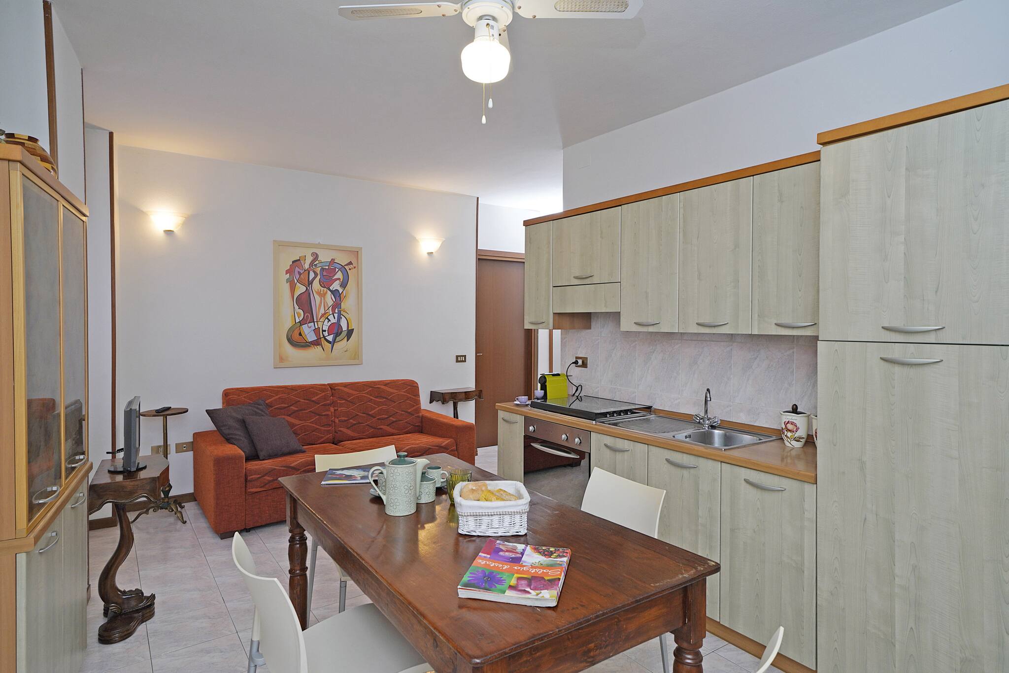 Gli ambienti, pur integrati, sono ben distinti: da un lato il salotto con divano e TV, dall'altro la cucina completamente attrezzata e un elegante tavolo da pranzo, perfetto per cene conviviali.