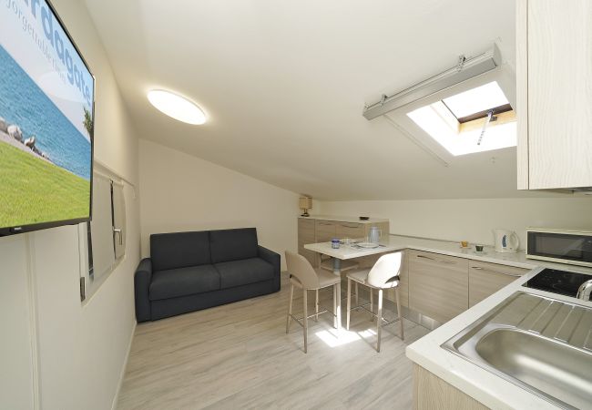 Arredato con uno stile unico, dove il legno fa da padrone, all’ingresso troverete subito l’angolo cottura completamente attrezzata e il soggiorno dotato di divano e ampio tavolo da pranzo; la sua luminosità è data dalla terrazza che si sviluppa in lunghezza, abbellita da fiori e piante, dal quale potete scorgere il lago e una parte del porto. Qui una cena o un aperitivo godendo delle fresche sere d’estate è d’obbligo.