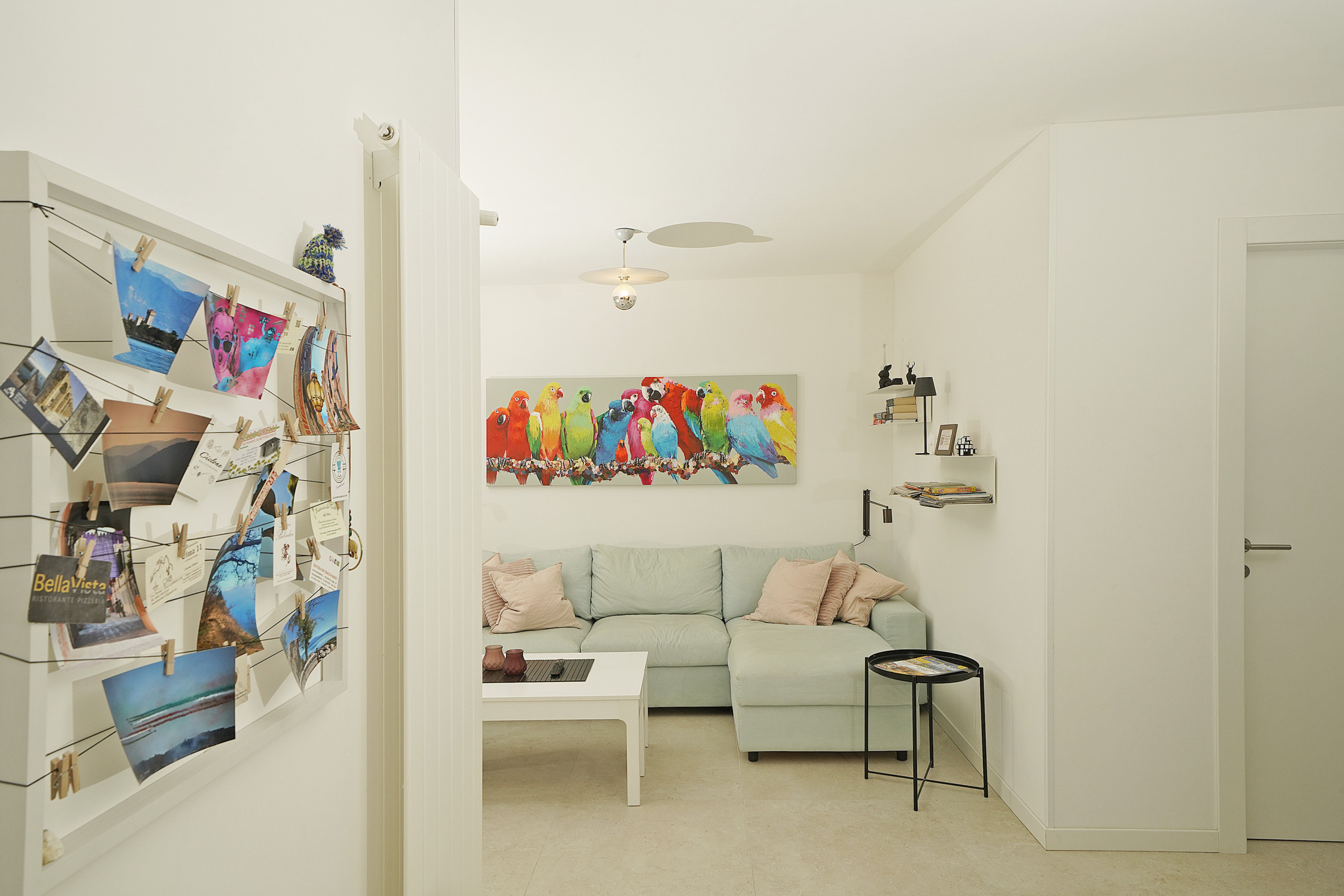 La prima stanza è composta da una zona giorno con cucina, divano letto per due persone e bagno. Questo ambiente funziona come un piccolo monolocale completo, perfetto per rilassarsi, cucinare e dormire.