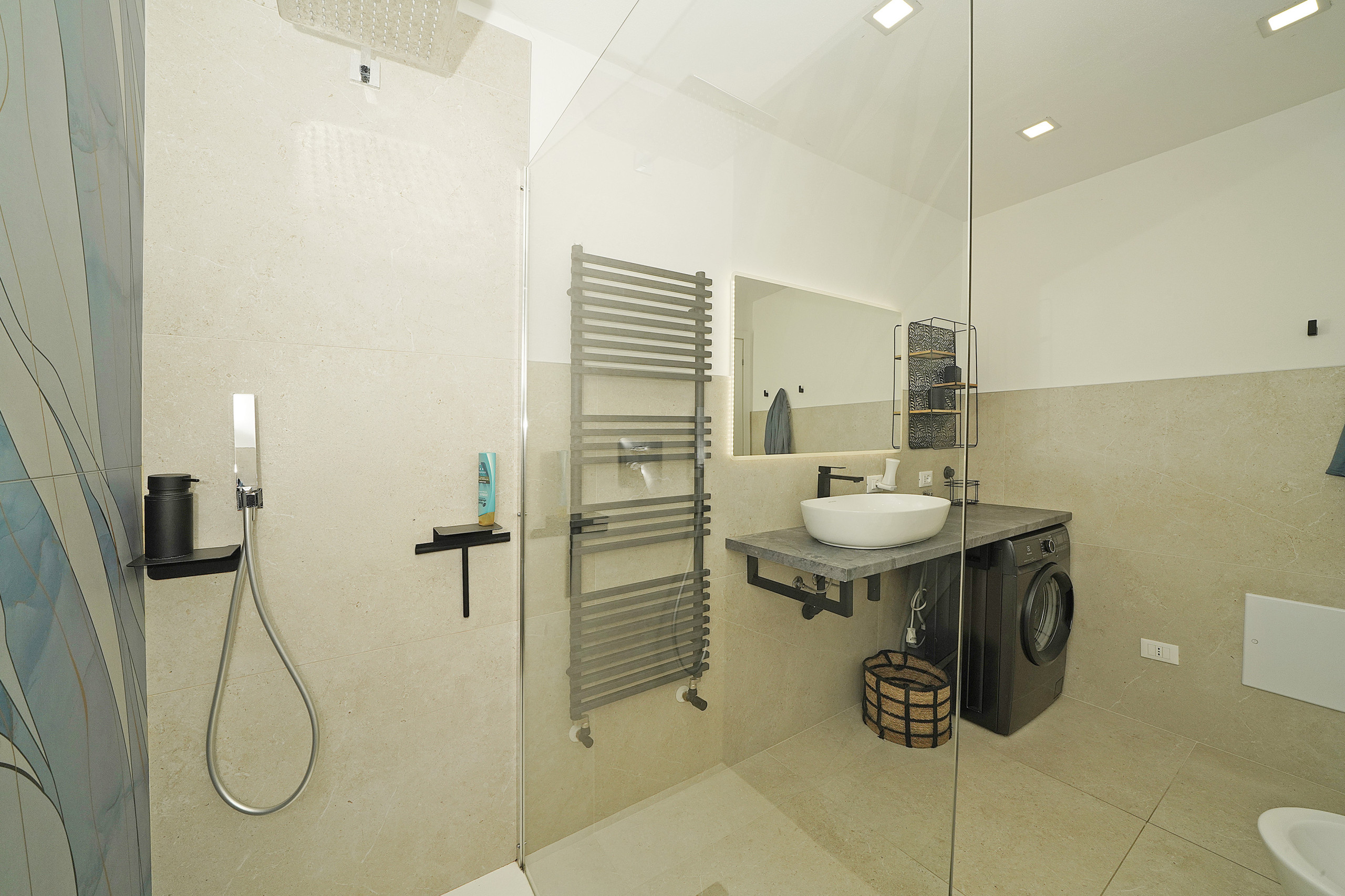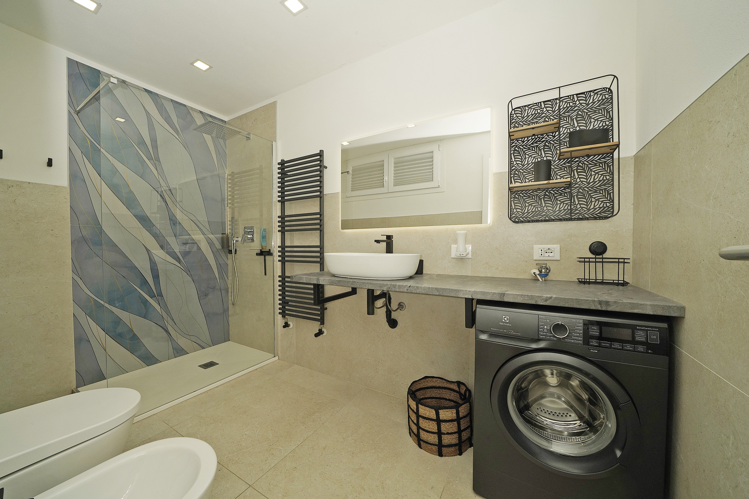 Accanto alla camera, si accede al bagno finestrato provvisto di box doccia, WC, bidet e lavatrice.