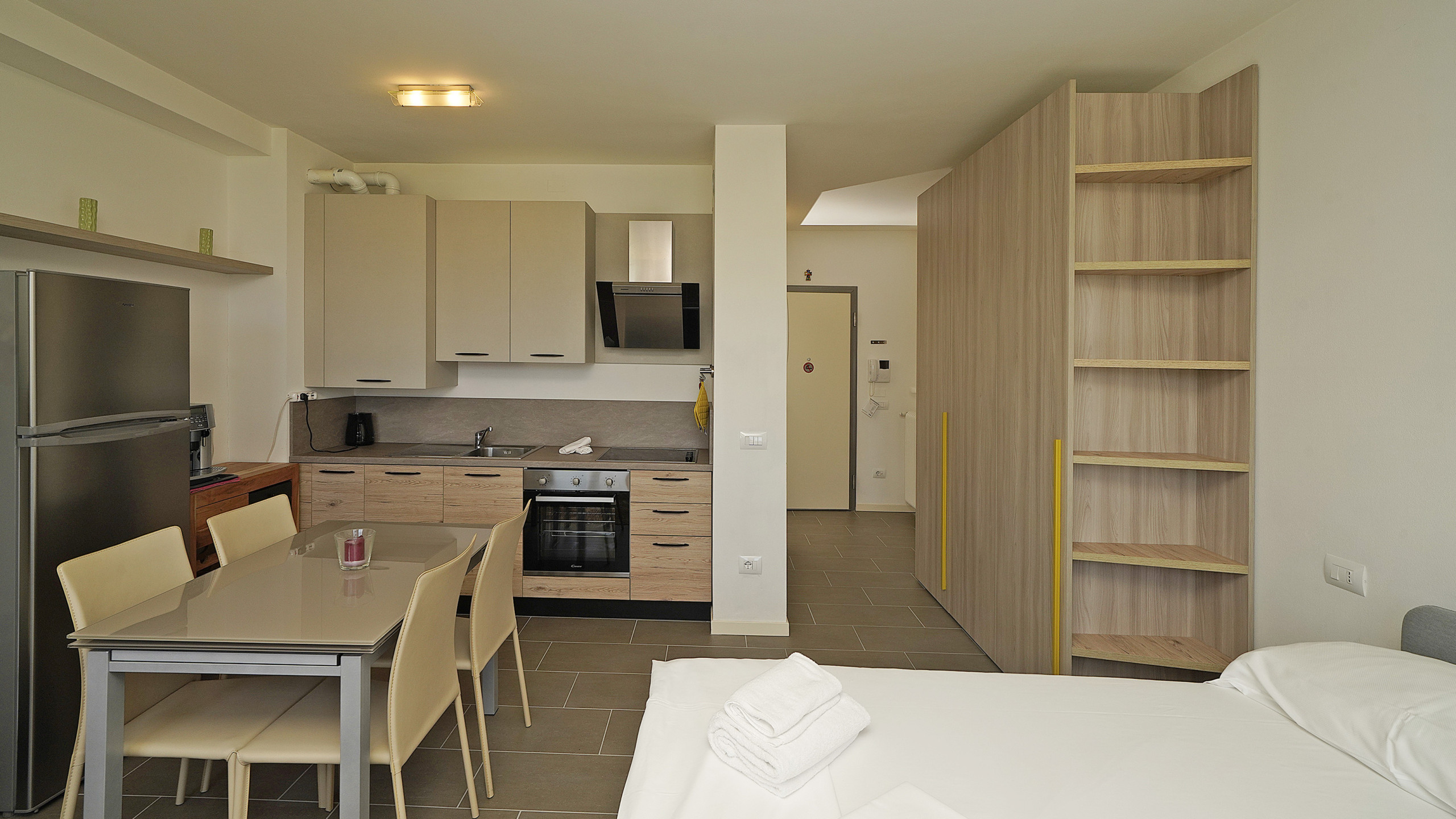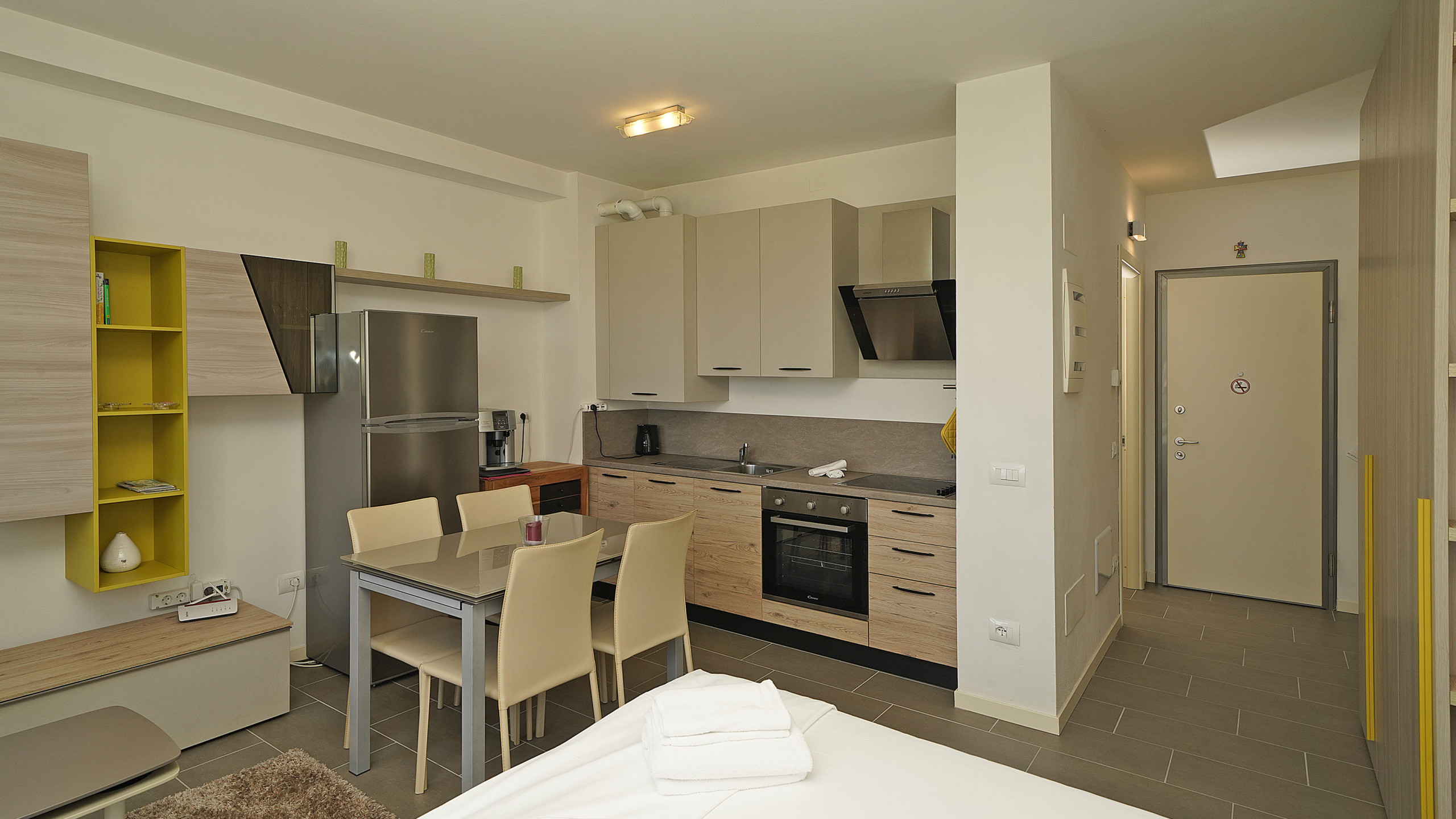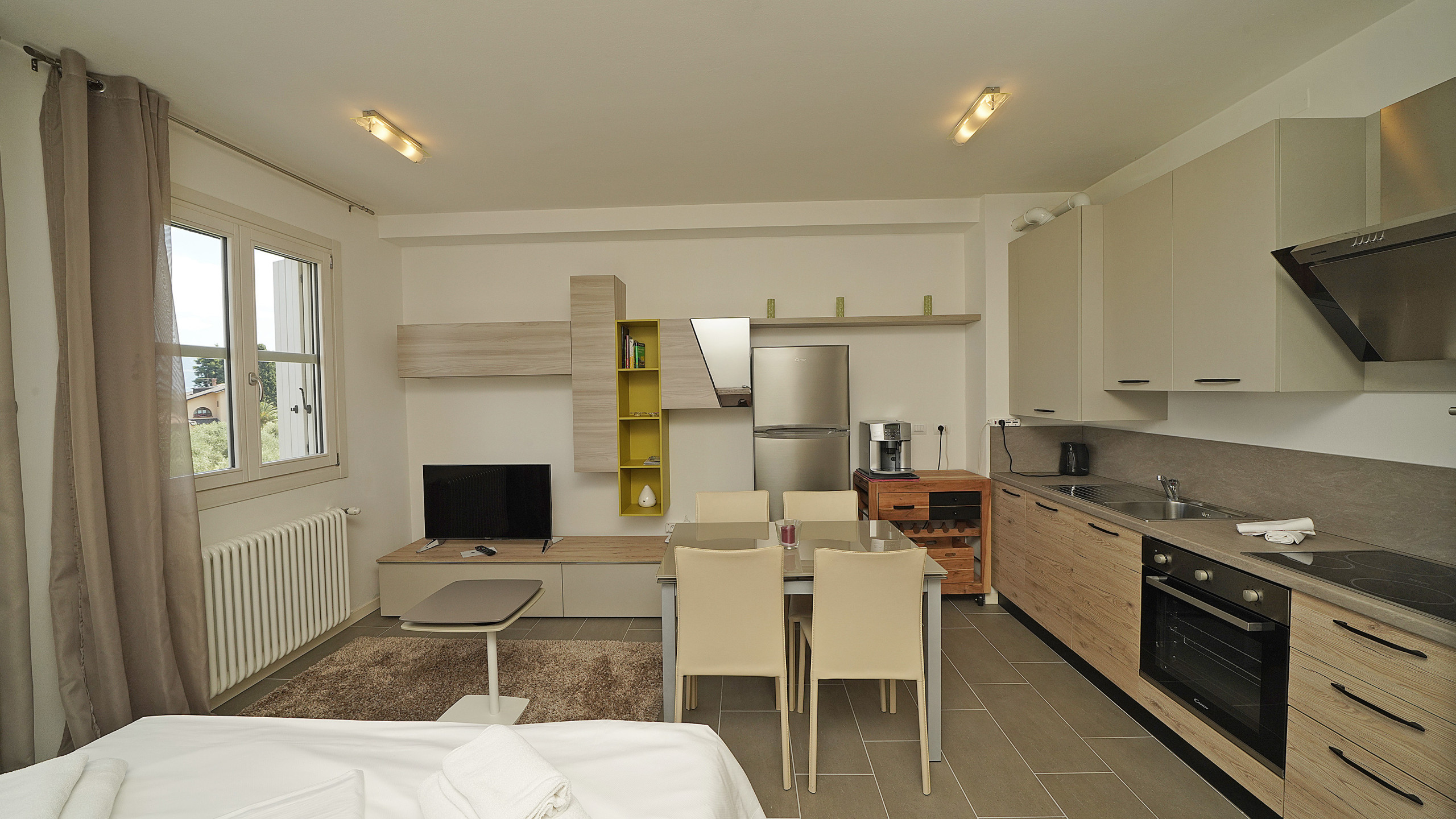L'appartamento vanta un'ampia camera da letto con un comodo letto matrimoniale, ideale per un riposo rigenerante. La cucina all'americana è completamente accessoriata e include tutti gli elettrodomestici necessari: frigorifero, forno, macchina del caffè, microonde, lavastoviglie e molto altro, permettendovi di preparare pasti deliziosi durante il vostro soggiorno.