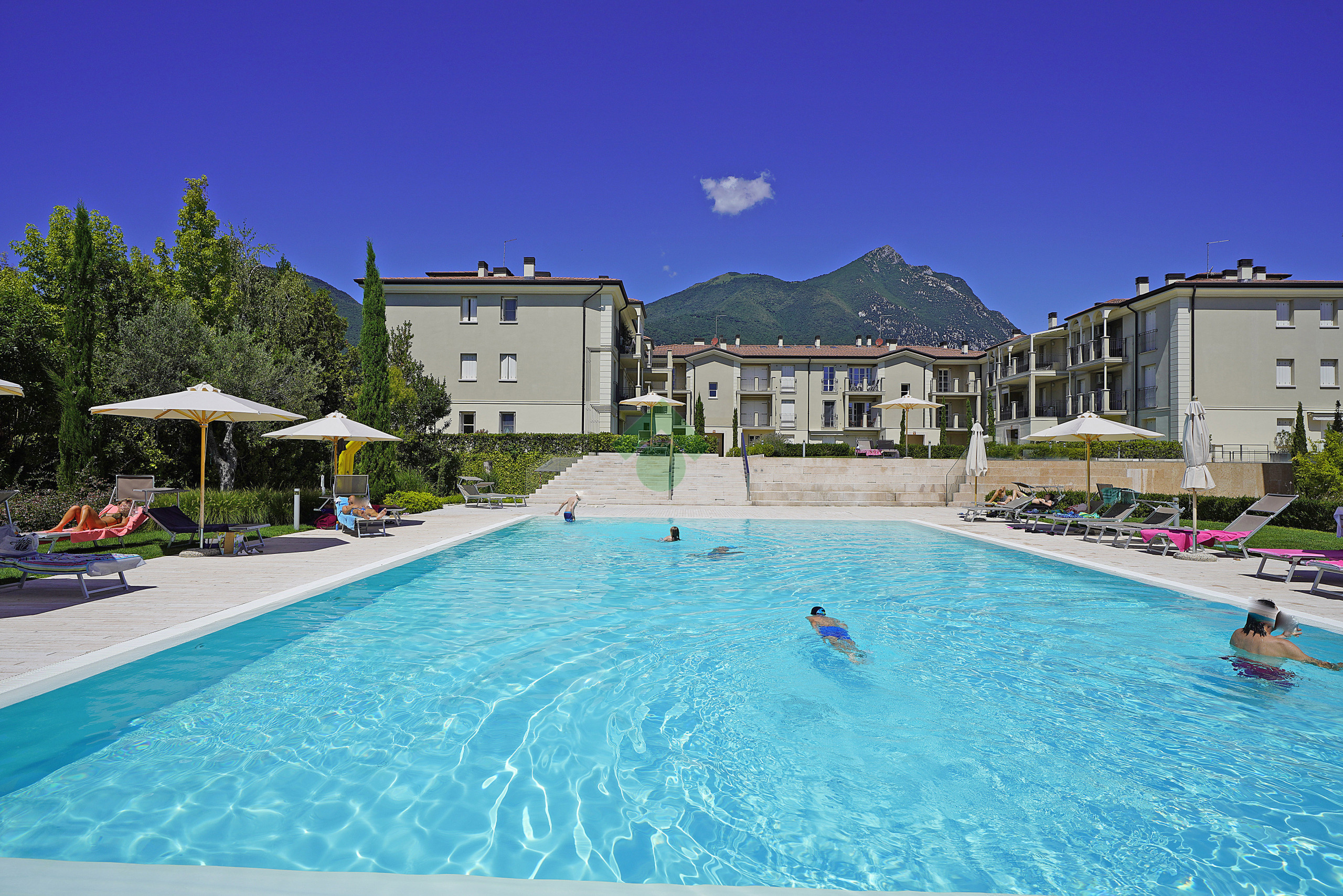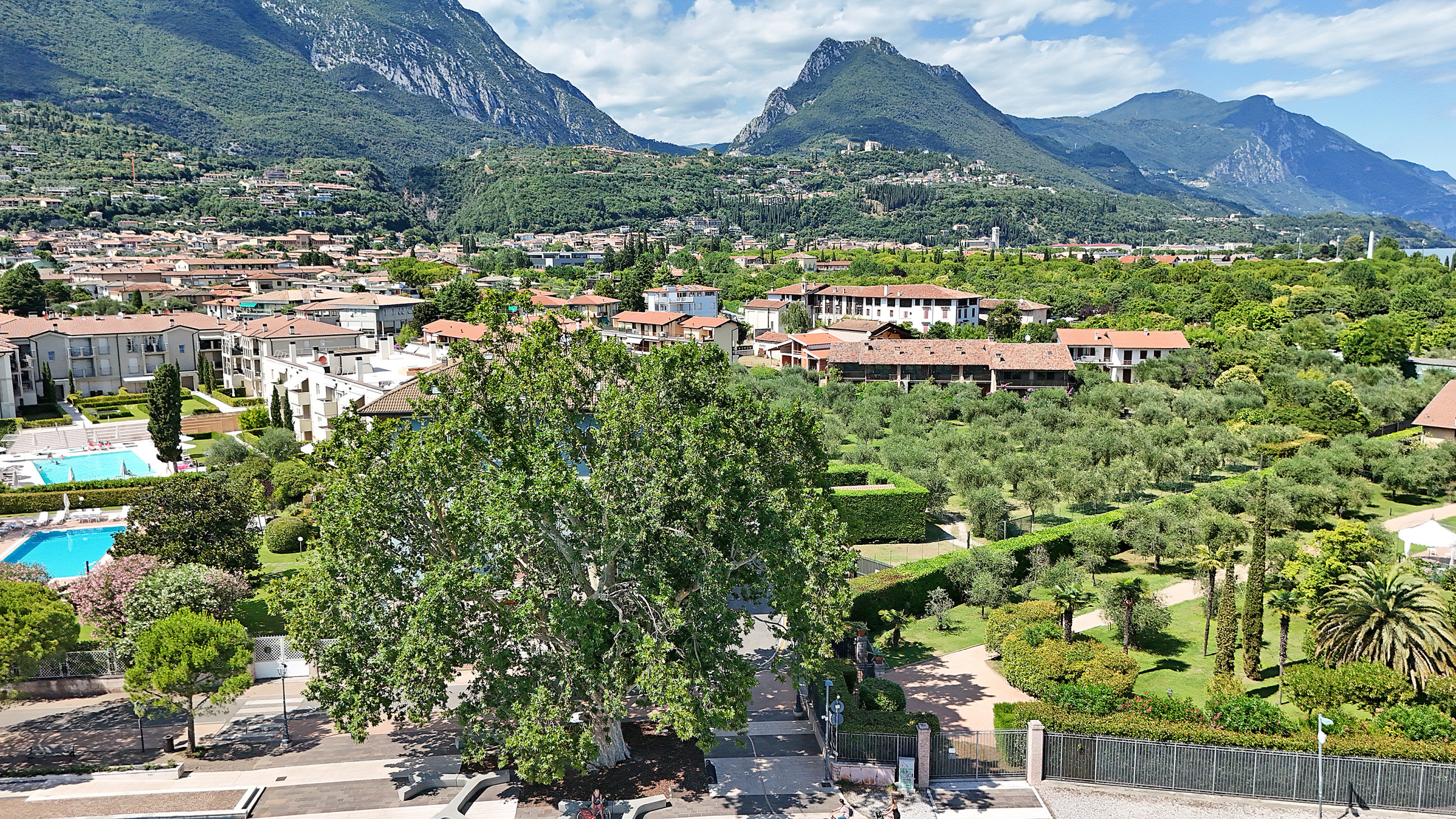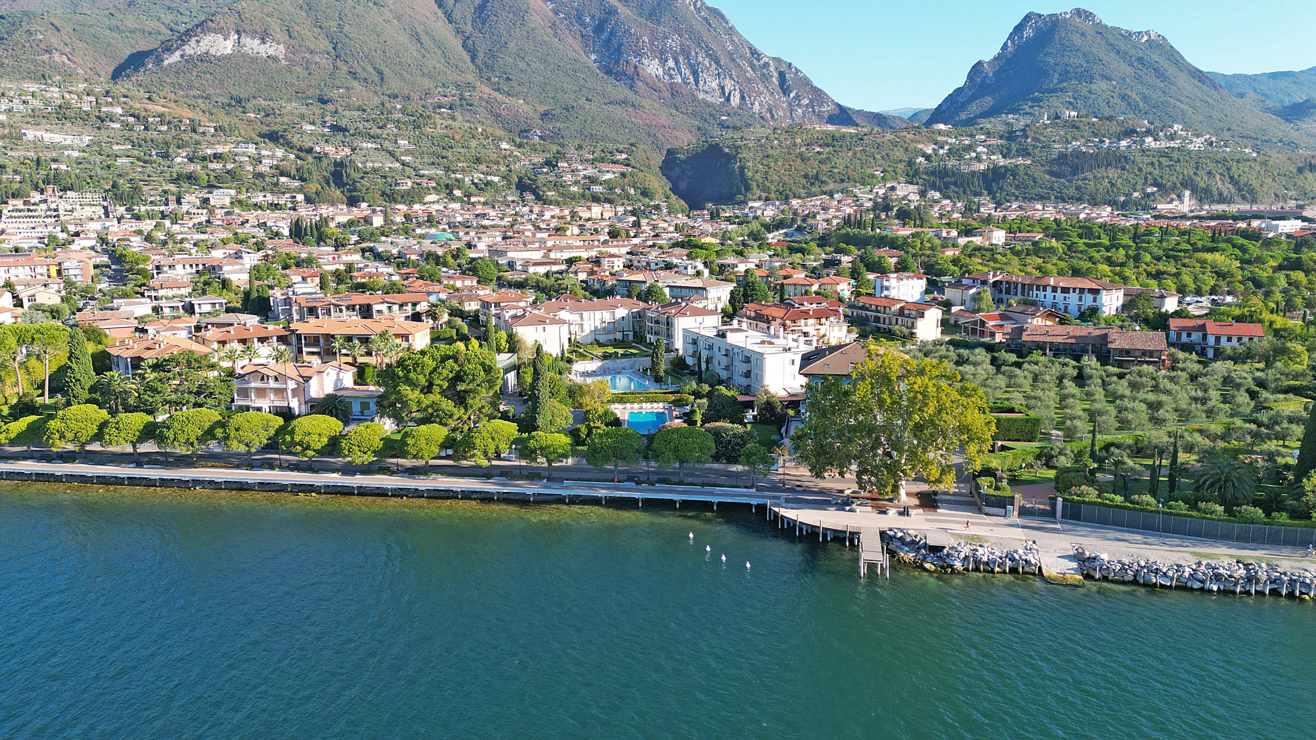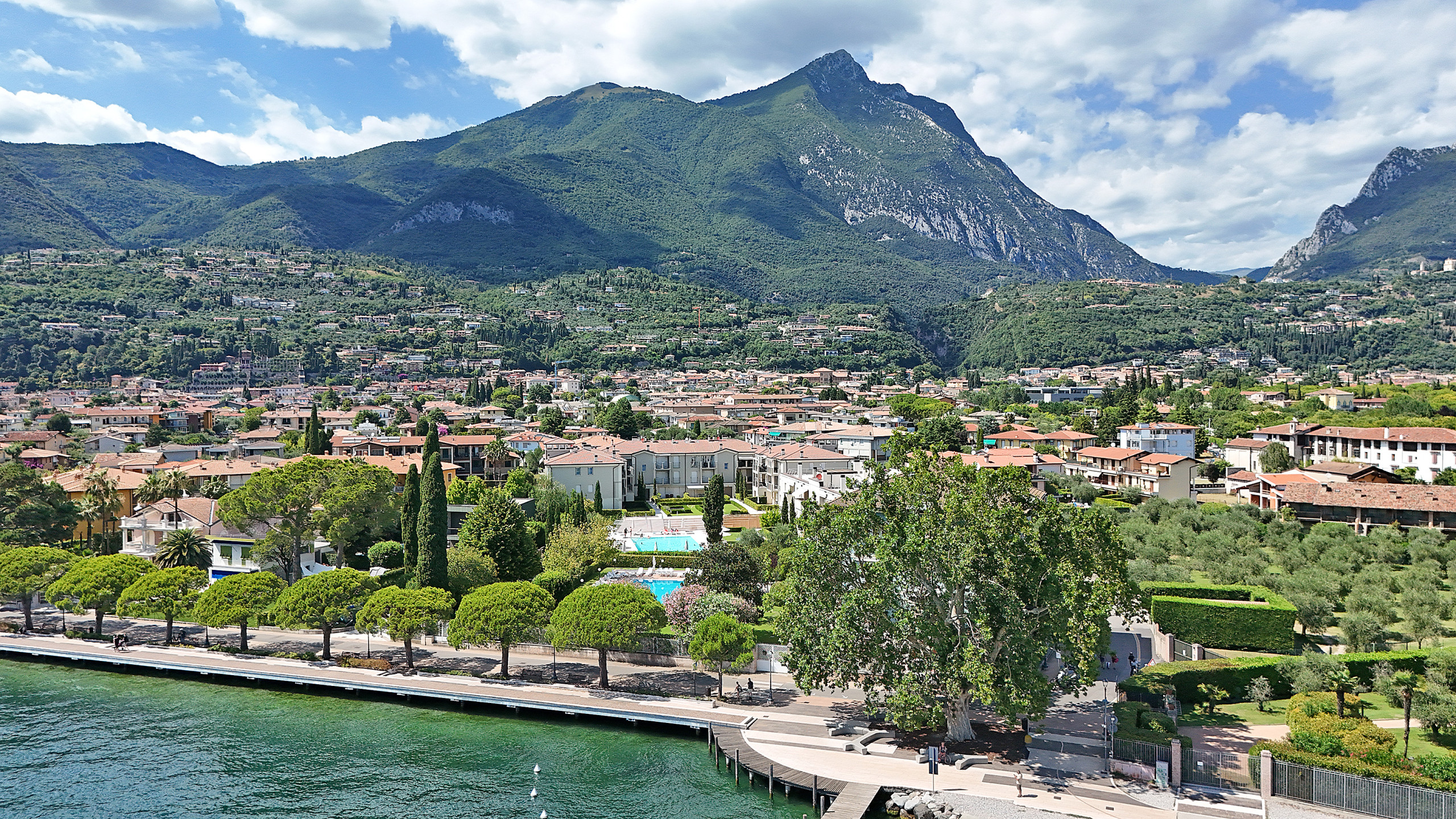 L'appartamento ha un soggiorno con divano letto estraibile, una camera da letto con comodo letto matrimoniale, una cucina aperta completamente attrezzata e un bagno con doccia. Godetevi ogni comfort nell'appartamento: balcone con vista sugli ulivi e in parte sul lago di Garda, aria condizionata e riscaldamento, ascensore, connessione internet/WLAN, TV, lavatrice, ferro/asse da stiro e asciugacapelli. La cucina aperta con piano cottura a induzione è dotata di frigorifero, microonde, forno, congelatore, lavastoviglie, stoviglie/posate, utensili da cucina, macchina da caffè, tostapane e bollitore. Per le vostre vacanze rilassanti avete accesso alla bellissima piscina con zona dedicata ai bambini. Il punto forte di questo appartamento è l'accesso alla grande terrazza solarium sul tetto di ca. 500 mq, riservata esclusivamente a pochi appartamenti, con una magnifica vista a 360 gradi sul lago di Garda. Sulla terrazza è anche presente una vasca idromassaggio. Il complesso è a due passi dal lungolago. Potete parcheggiare la vostra auto nel garage sotterraneo privato. Il garage accoglie macchine di normali dimensioni, i suv o macchine grosse non entrano. Supermercati, ristoranti, gelateria, banca, ufficio postale, ecc. sono raggiungibili a piedi.