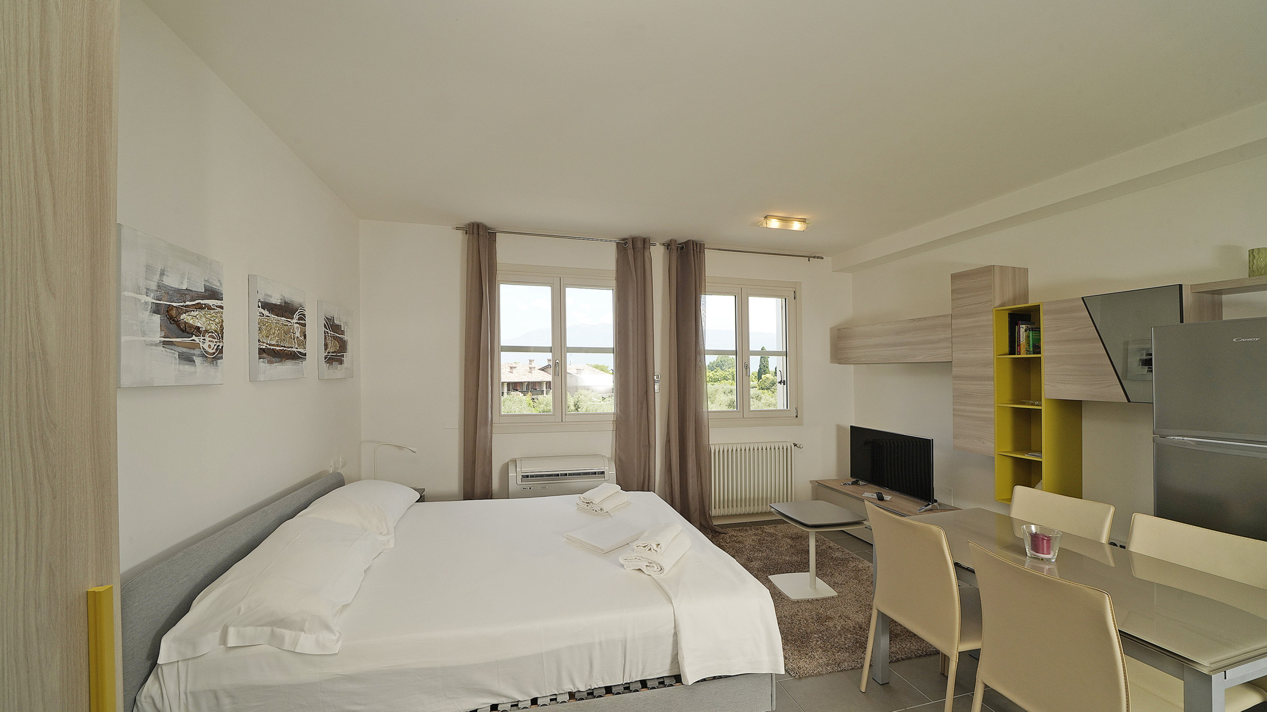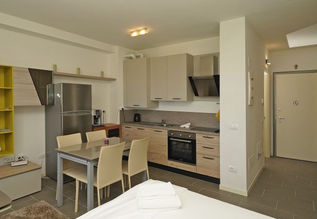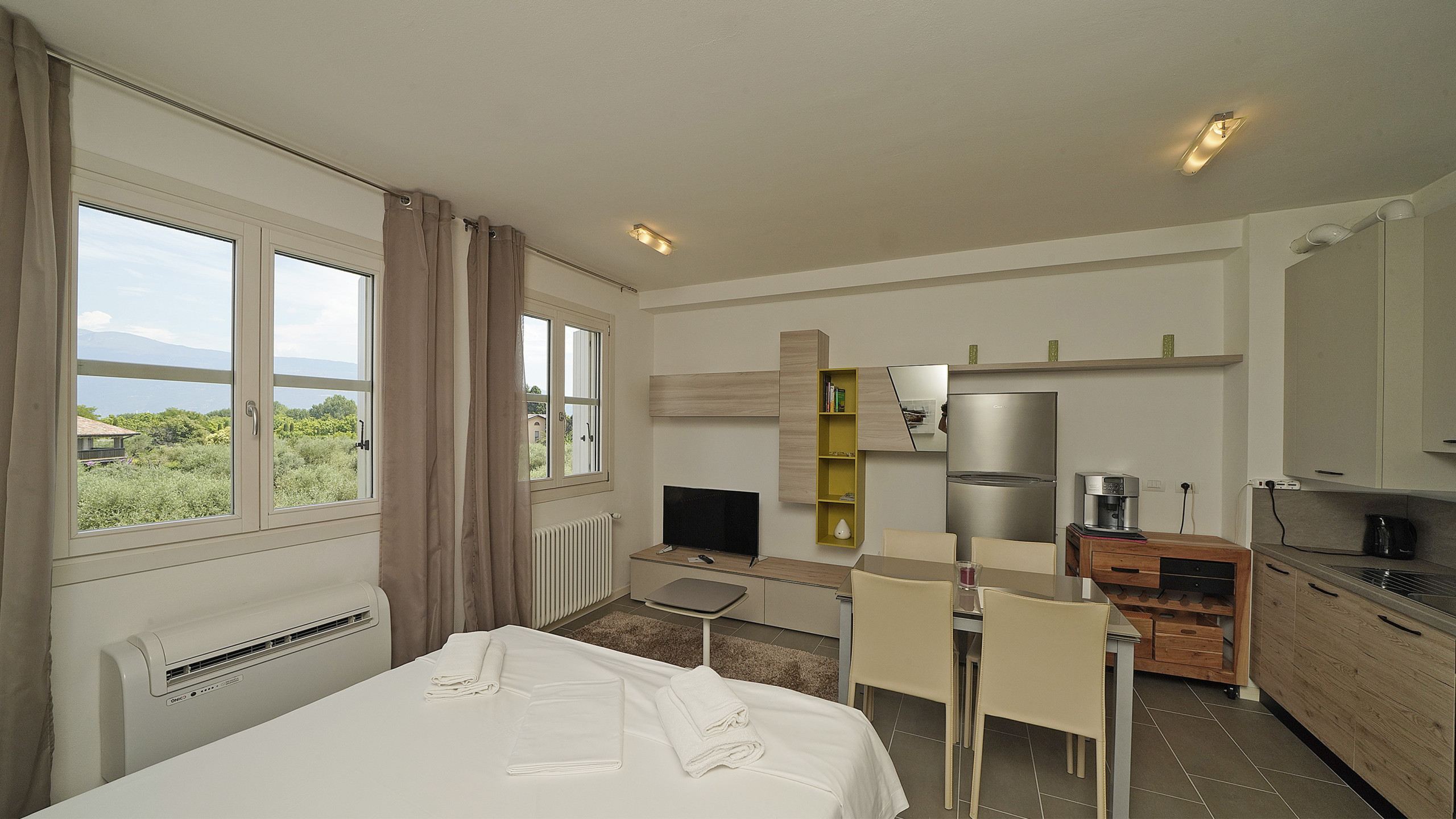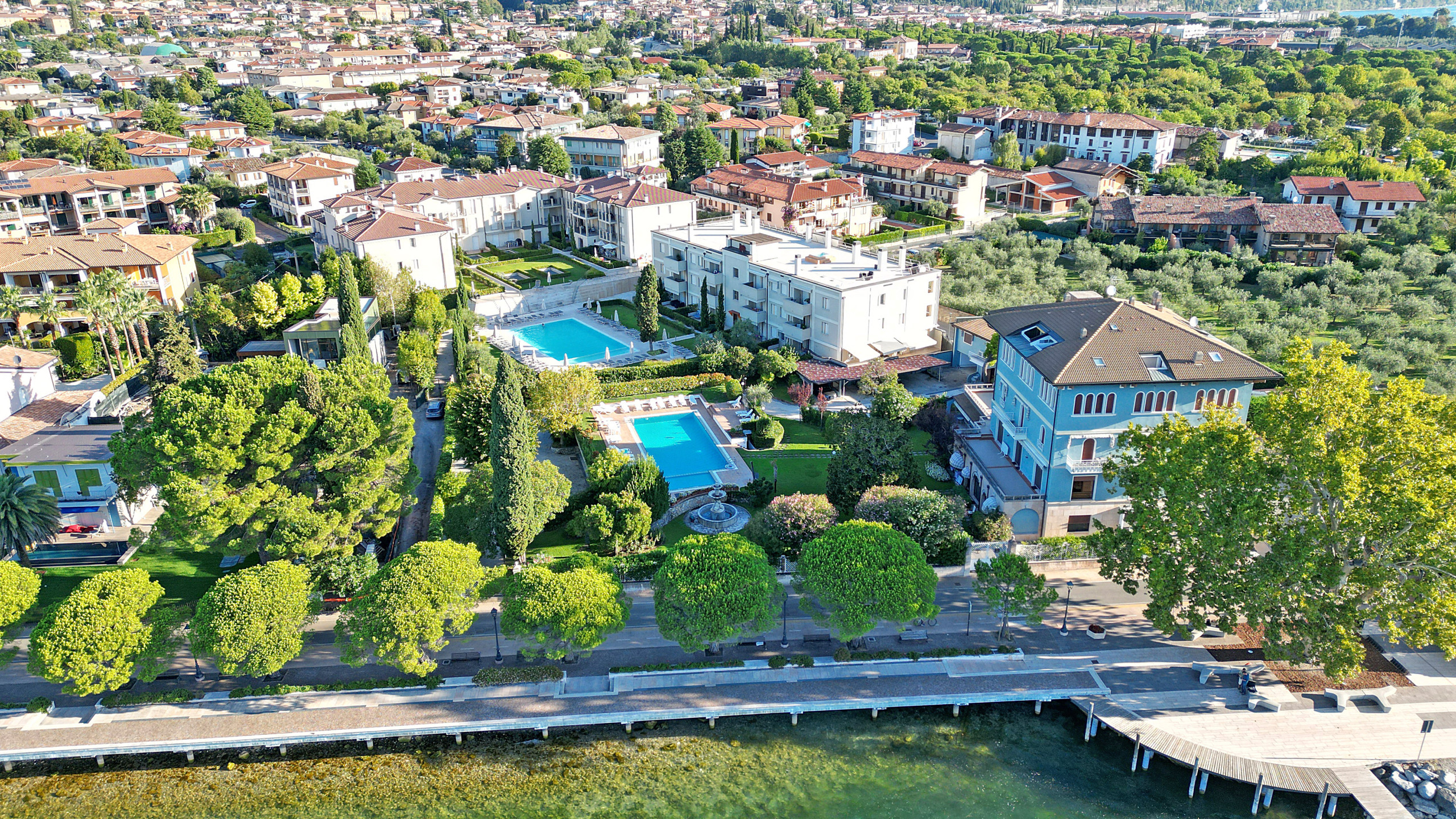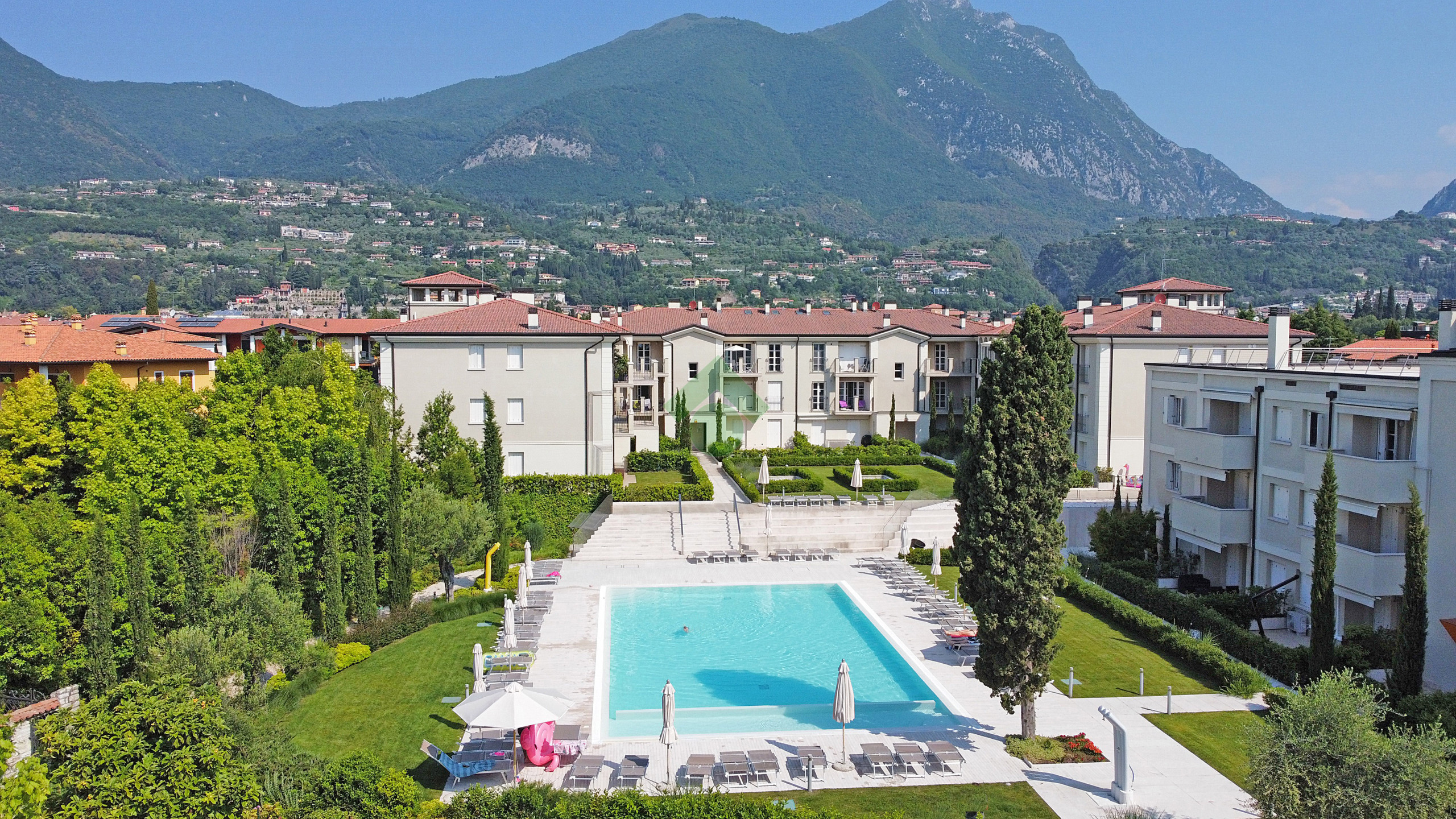 L'appartamento ha un soggiorno con divano letto estraibile, una camera da letto con comodo letto matrimoniale, una cucina aperta completamente attrezzata e un bagno con doccia. Godetevi ogni comfort nell'appartamento: balcone con vista sugli ulivi e in parte sul lago di Garda, aria condizionata e riscaldamento, ascensore, connessione internet/WLAN, TV, lavatrice, ferro/asse da stiro e asciugacapelli. La cucina aperta con piano cottura a induzione è dotata di frigorifero, microonde, forno, congelatore, lavastoviglie, stoviglie/posate, utensili da cucina, macchina da caffè, tostapane e bollitore. Per le vostre vacanze rilassanti avete accesso alla bellissima piscina con zona dedicata ai bambini. Il punto forte di questo appartamento è l'accesso alla grande terrazza solarium sul tetto di ca. 500 mq, riservata esclusivamente a pochi appartamenti, con una magnifica vista a 360 gradi sul lago di Garda. Sulla terrazza è anche presente una vasca idromassaggio. Il complesso è a due passi dal lungolago. Potete parcheggiare la vostra auto nel garage sotterraneo privato. Il garage accoglie macchine di normali dimensioni, i suv o macchine grosse non entrano. Supermercati, ristoranti, gelateria, banca, ufficio postale, ecc. sono raggiungibili a piedi.