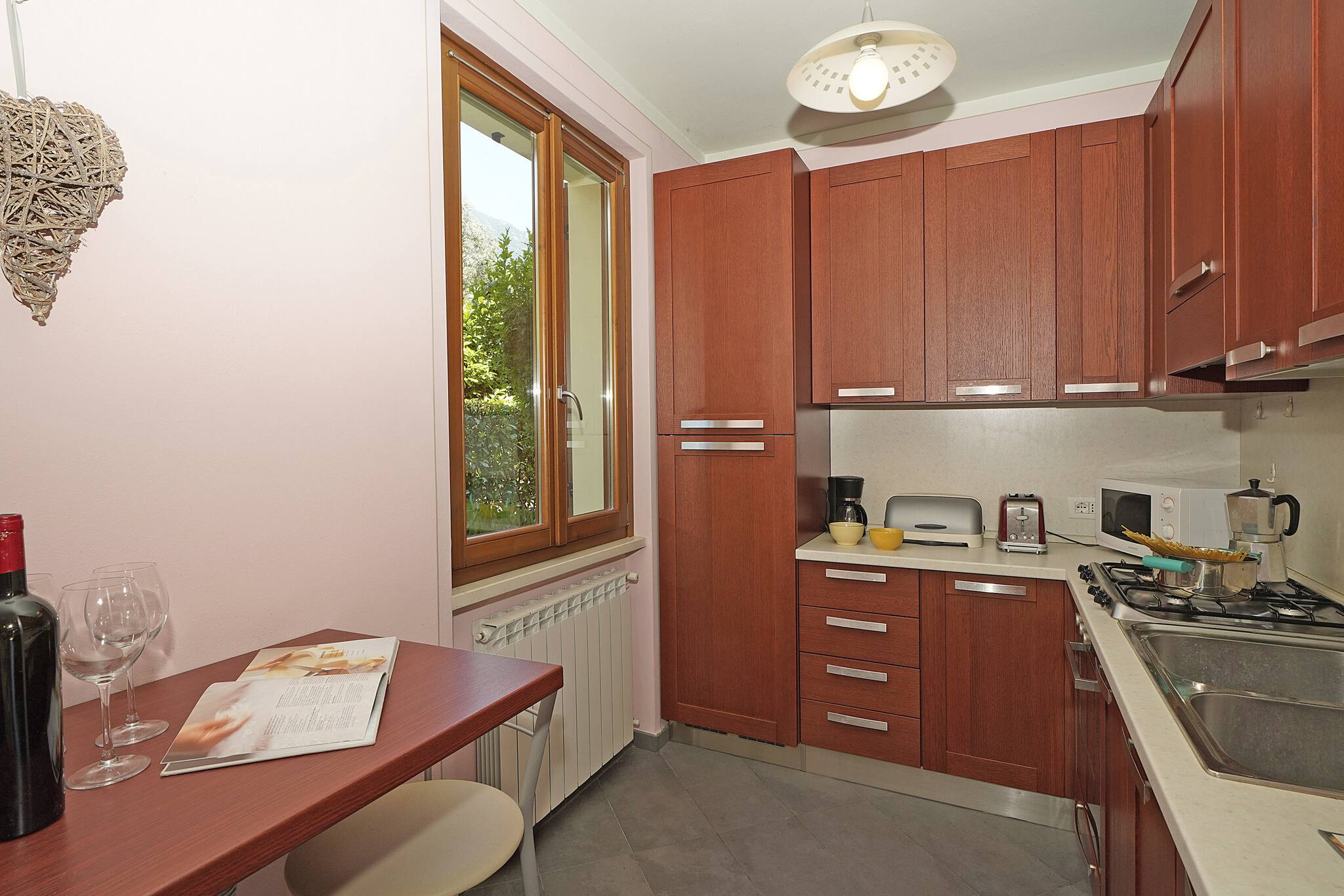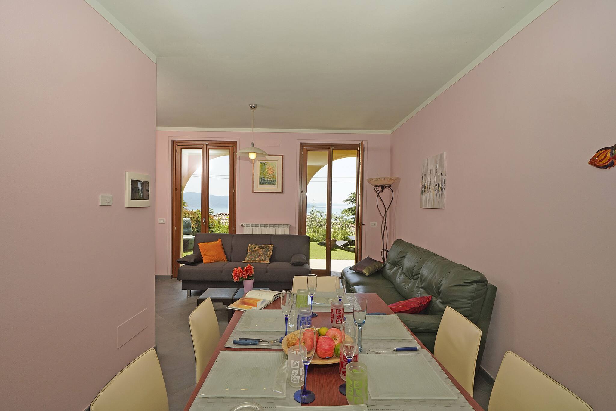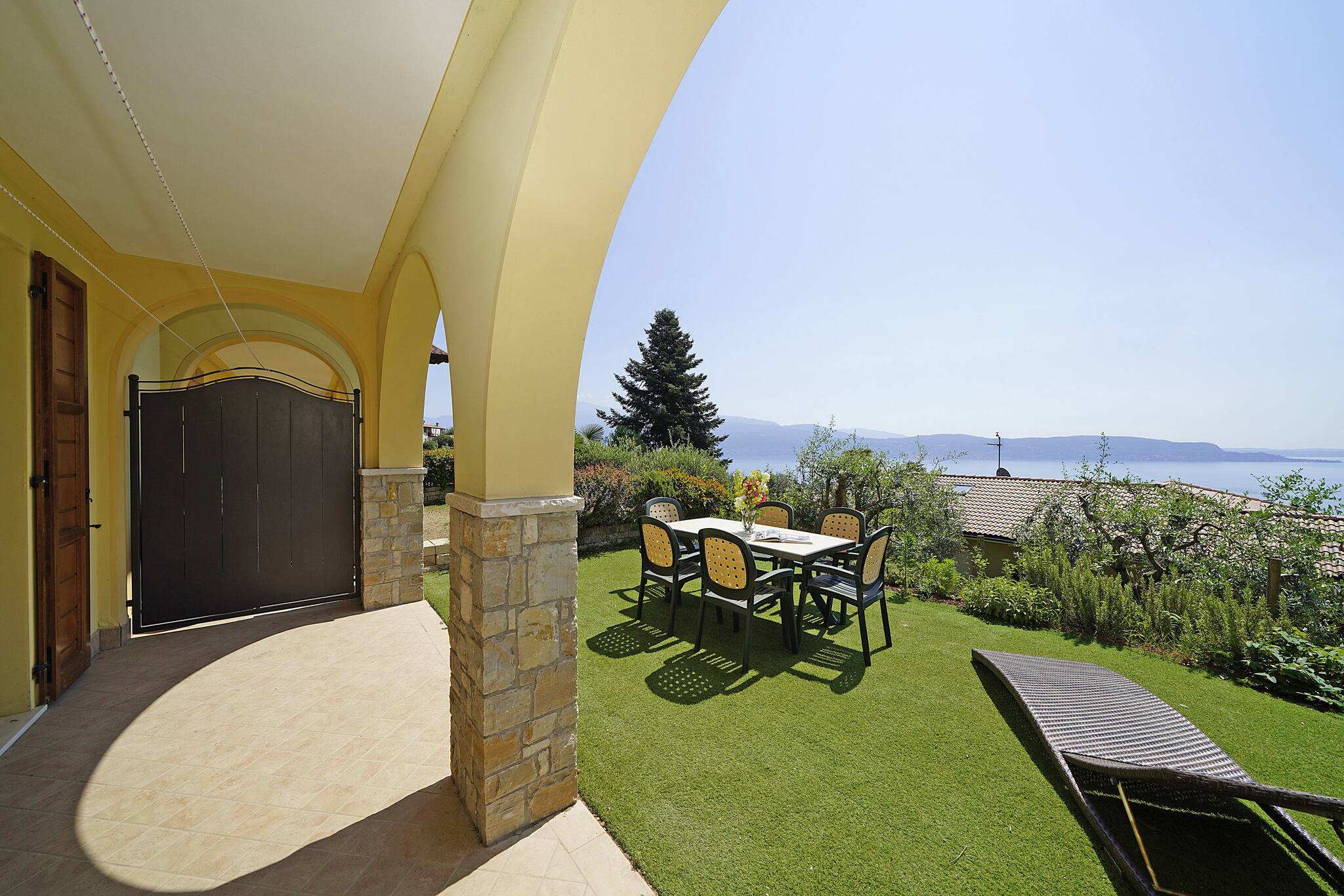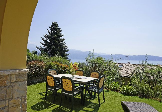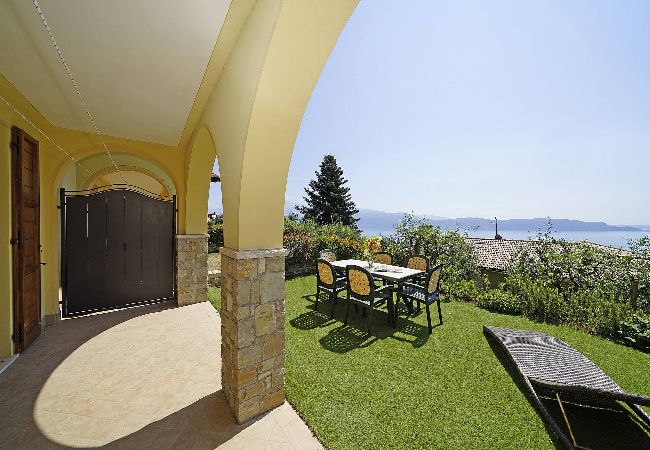 Villetta a piano terra. Soggiorno: un divano, stereo, tavolo da pranzo. Accesso diretto al portico vista lago con giardino privato attrezzato con tavolo e sedie. Cucina ad angolo nascosta a gas con piccolo tavolo di appoggio: frigo con freezer, stoviglie e pentole, lavastoviglie, forno, microonde, macchina caffè americano, moka per caffè italiano,tostapane. 1 bagno finestrato: lavabo, bidet, doccia.