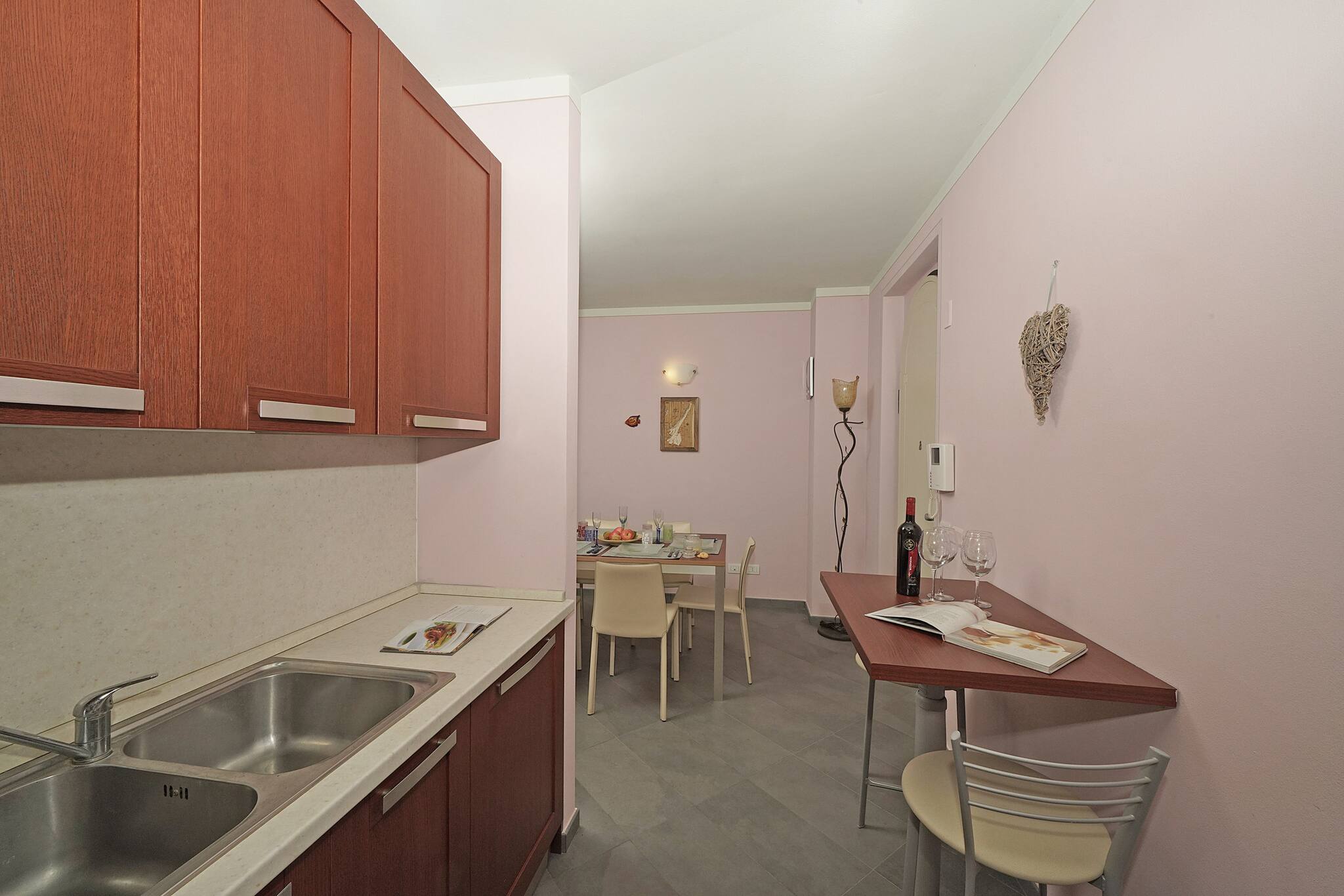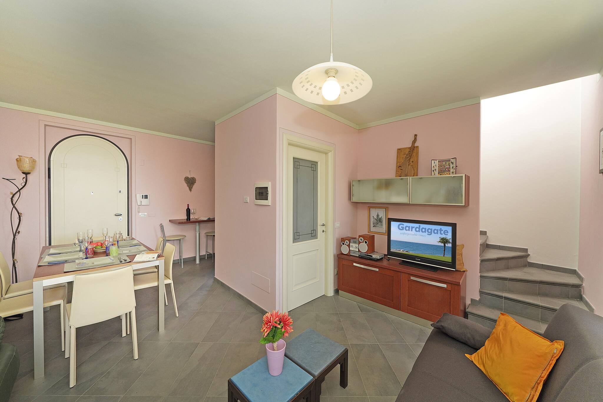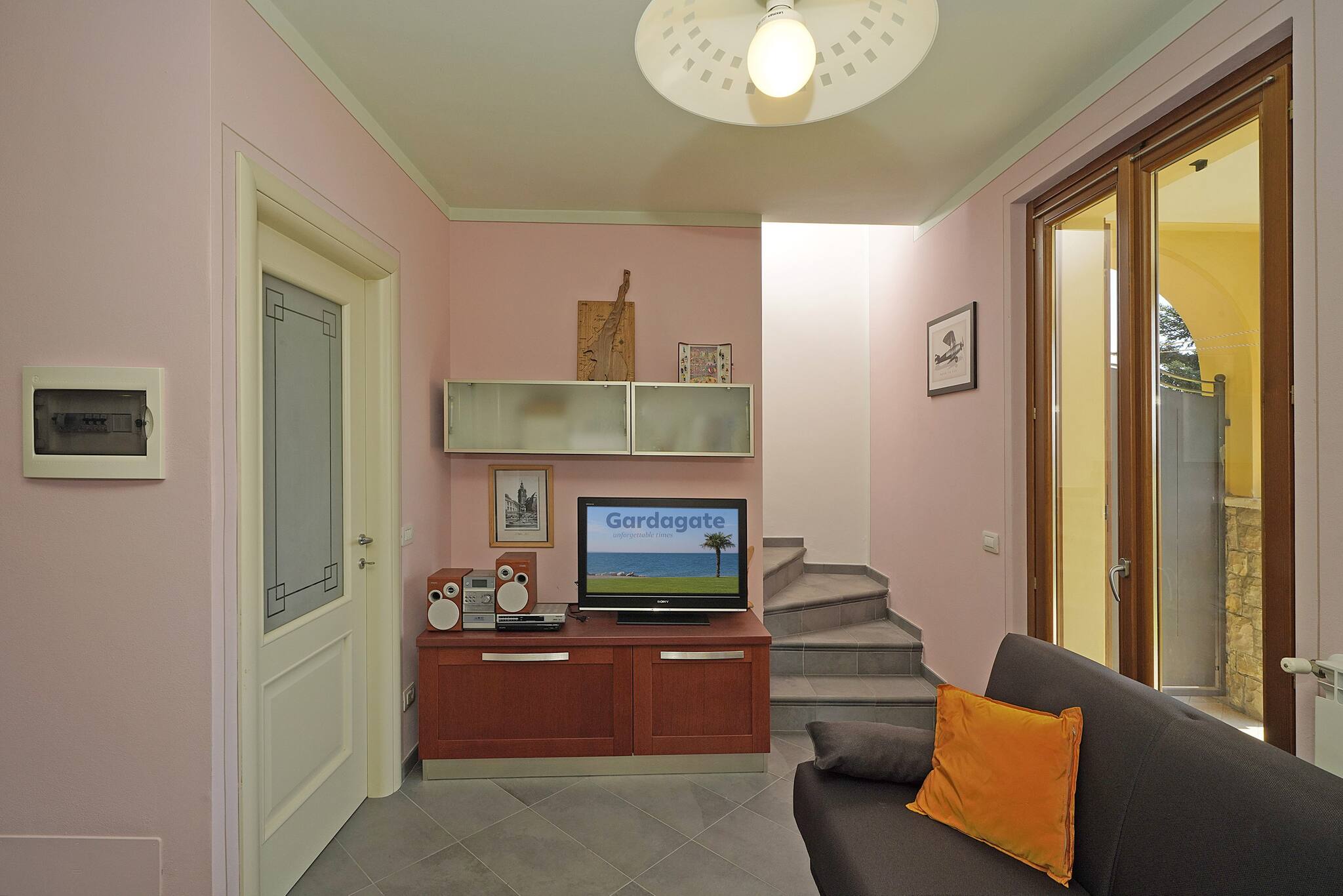 Villetta a piano terra. Soggiorno: un divano, stereo, tavolo da pranzo. Accesso diretto al portico vista lago con giardino privato attrezzato con tavolo e sedie. Cucina ad angolo nascosta a gas con piccolo tavolo di appoggio: frigo con freezer, stoviglie e pentole, lavastoviglie, forno, microonde, macchina caffè americano, moka per caffè italiano,tostapane. 1 bagno finestrato: lavabo, bidet, doccia.