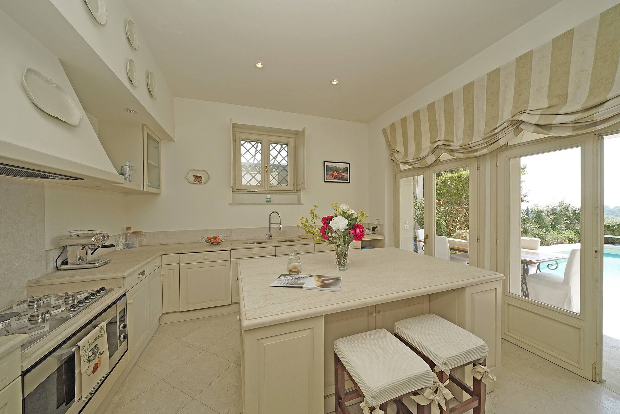Scendendo le scale si accede al reale piano terra con: ampia cucina separata completamente attrezzata con penisola: lavastoviglie,forno,macchinetta del caffè,tostapane, stoviglie; dalla cucina si accede direttamente al portico attrezzato con tavolo e sedie da pranzo e alla piscina privata. A lato piccola cucina esterna. Su questo stesso piano si trova il terzo bagno separato con doppio lavabo, doccia, wc e bidet con porta finestra che guarda il giardino.Proseguendo si accede ad uno spazio lavanderia con lavatrice. La villa prosegue poi con una depandance con aria condizionata, unita ma separata negli spazi: è composta da una camera matrimoniale , un bagno privato con wc, bidet e doccia doppia e una 2°cucina completamente attrezzata con: forno, microonde, tostapane, frullatore e macchinetta del caffè da bar professionale. Media: smart tv Wifi: incluso . 2 Posti auto esterni privati ma interni alla proprietà. SERVIZI EXTRA: chef privato su prenotazione a pagamento