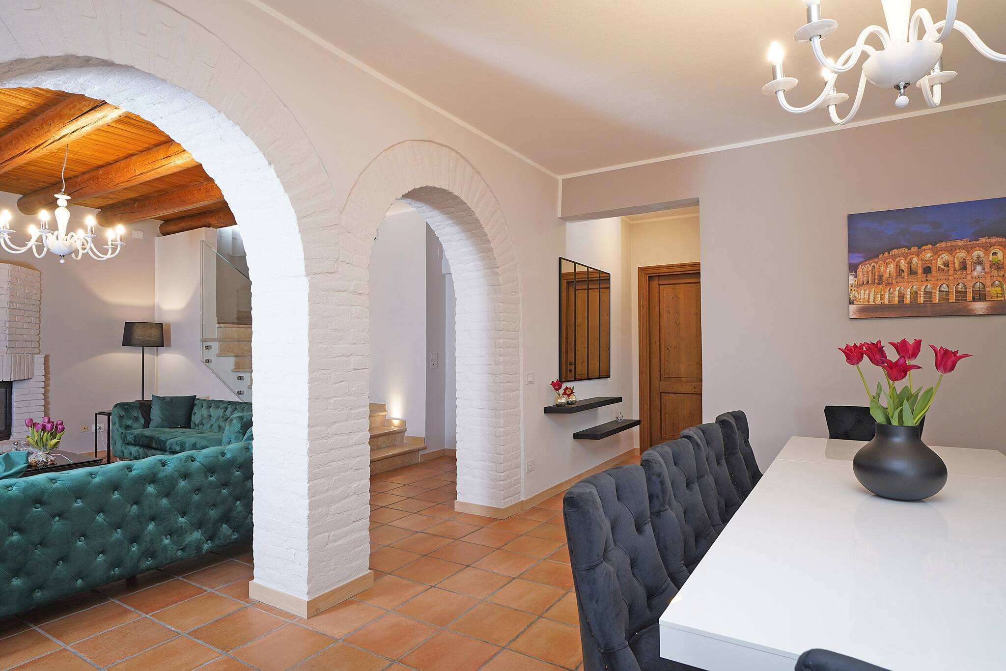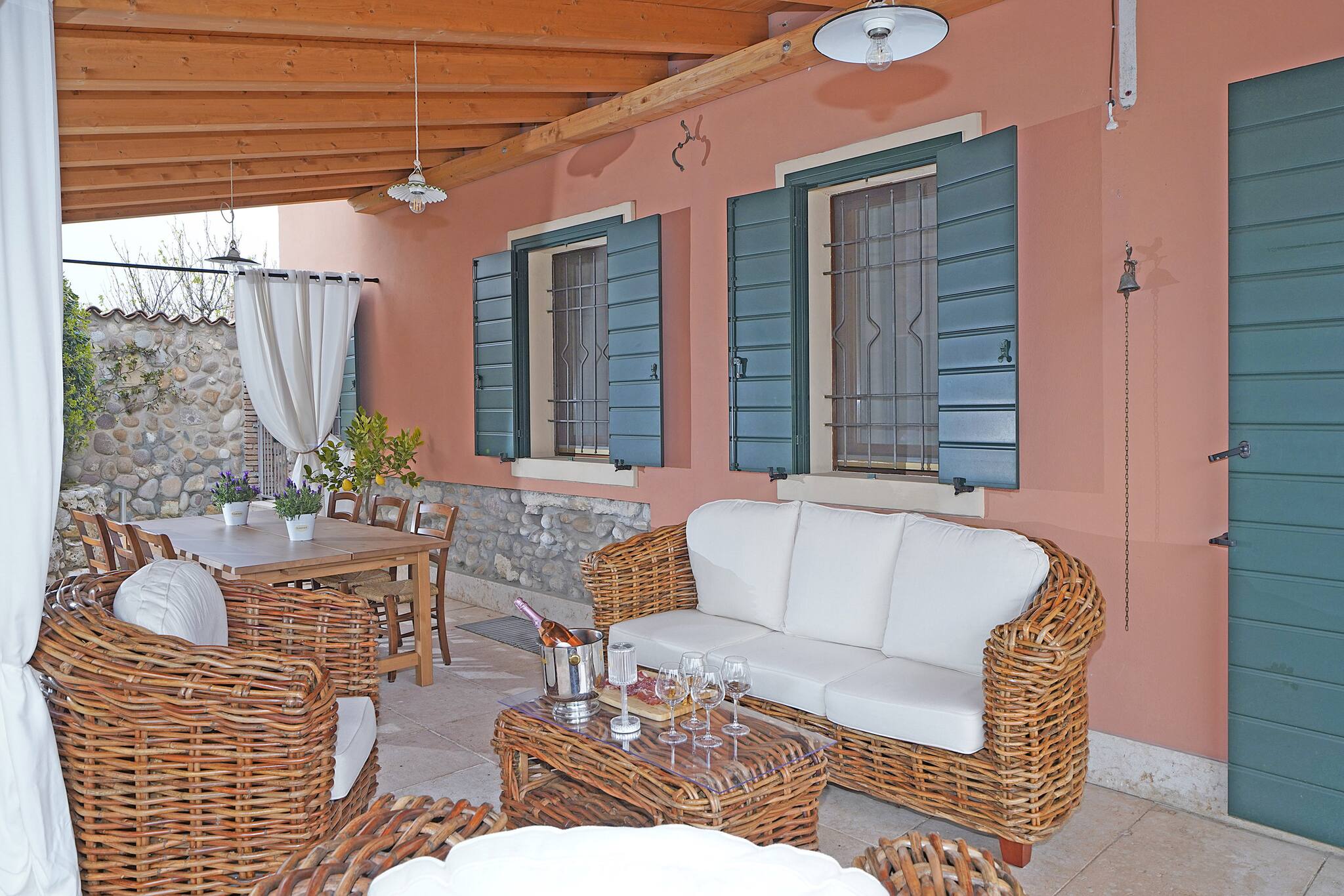 Villa storica singola a pochi chilometri dalla città di Verona, circondata da vigneti. Sviluppata su due piani così disposti: piano terra con sala con camino , due divani , smart tv con 52' con piattaforma Sky. Cucina a gas separata di 20 mq completamente fornita: forno, forno a microonde, macchinetta del caffè, tostapane, bollitore,frigo americano con freezer. Camera doppia con divano letto e scrivania per smart working; bagno con doccia,lavandino, wc, bidet.