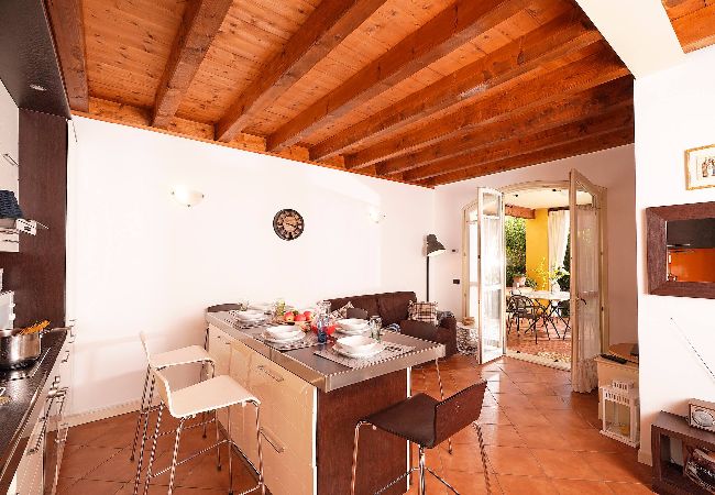 From the entrance you will immediately access the living room with kitchen and high peninsula where you can eat; in front of it , you will find the double sofa bed positioned at the large French window overlooking the lovely porch with small private garden where you can enjoy the summer breeze sipping a good drink. The living room leads to the elegant double bedroom and to the bathroom equipped with washbasin, toilet, bidet, shower and washing machine. Large free swimming available pool for guests. Outdoor parking is available near the property.. Kurtaxe: € 1,60 pro Tag pro Person, zahlbar beim Check-in