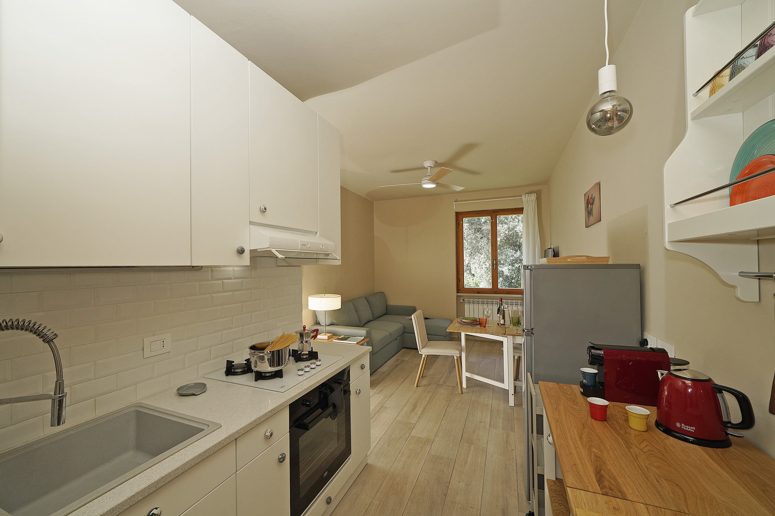Mit Eingang im Erdgeschoss gelangt man in die geräumige, vollständig ausgestattete Küche, die durch eine Schiebetür vom hellen Wohnzimmer mit Schlafsofa, TV und Esstisch getrennt ist; das Highlight dieser Wohnung ist die Terrasse, groß und geräumig, ideal zum Abendessen und Genießen der kühlen Sommerabende fernab vom Verkehrslärm. Rechts vom Wohnzimmer gelangt man zum Doppelschlafzimmer und zum entzückenden Badezimmer mit Dusche. Poolnutzung für Gäste kostenlos. Kostenlose Garage.
