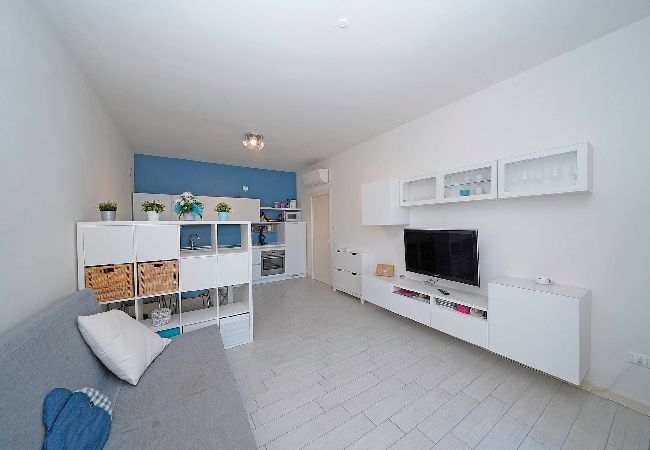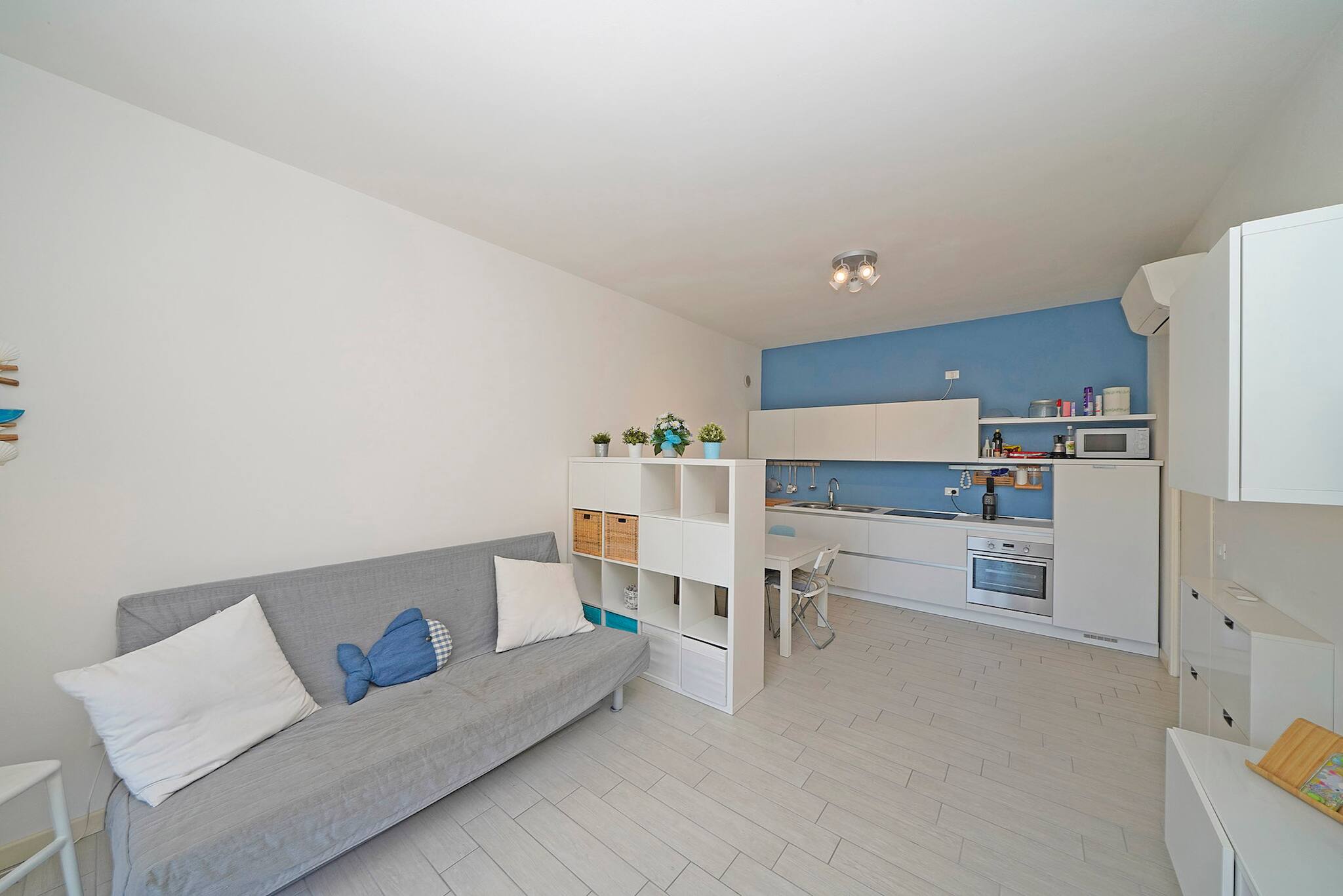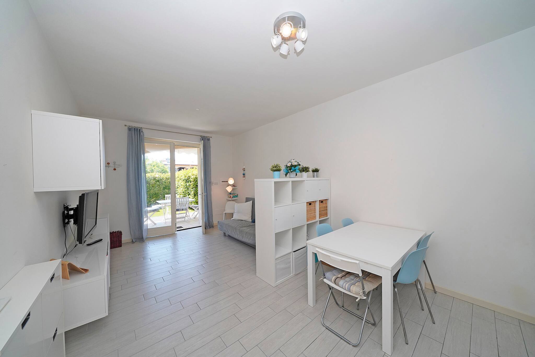 Flat on the outskirts of the historic centre of Sirmione. in a well-kept, spacious residence with private access to the lake. First floor accessible by stairs. Living room: double sofa bed, TV and dining table. Fully equipped electric kitchen with oven, fridge with freezer, crockery and cookware, Italian moka, dishwasher. Small balcony with lake view. Air conditioning. 1 bathroom: washbasin, bidet, shower. 1 large bedroom: double bed with wardrobe. Media: tv Wifi: included .