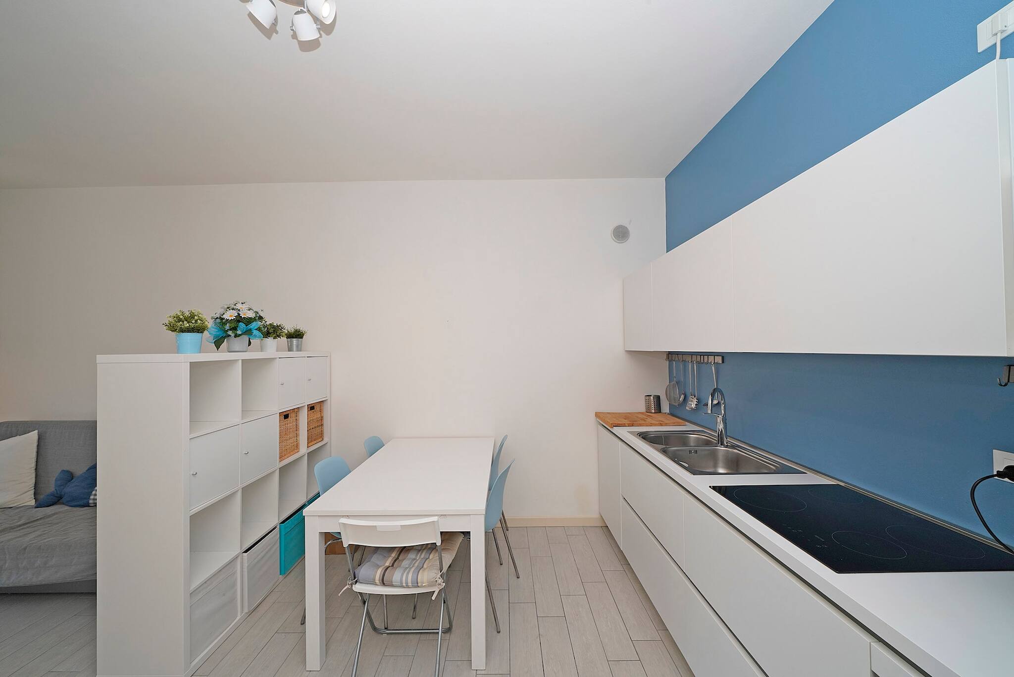 With entrance to the first floor, upon entering we immediately find the living area and the kitchen in the same harmonious environment equipped with a sofa bed with wall-mounted flat-screen TV and a fully equipped kitchen with an extendable table for up to 6 people.