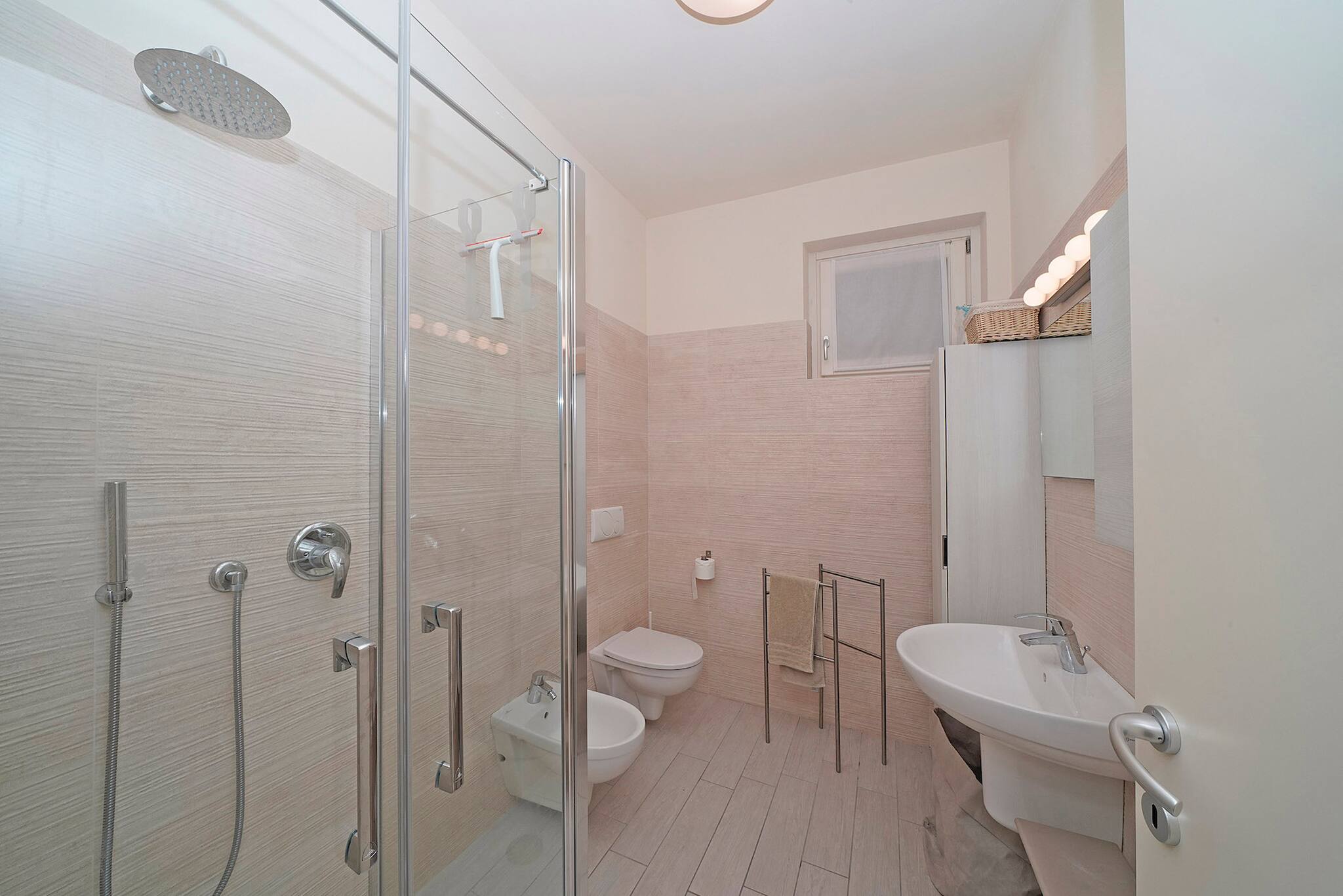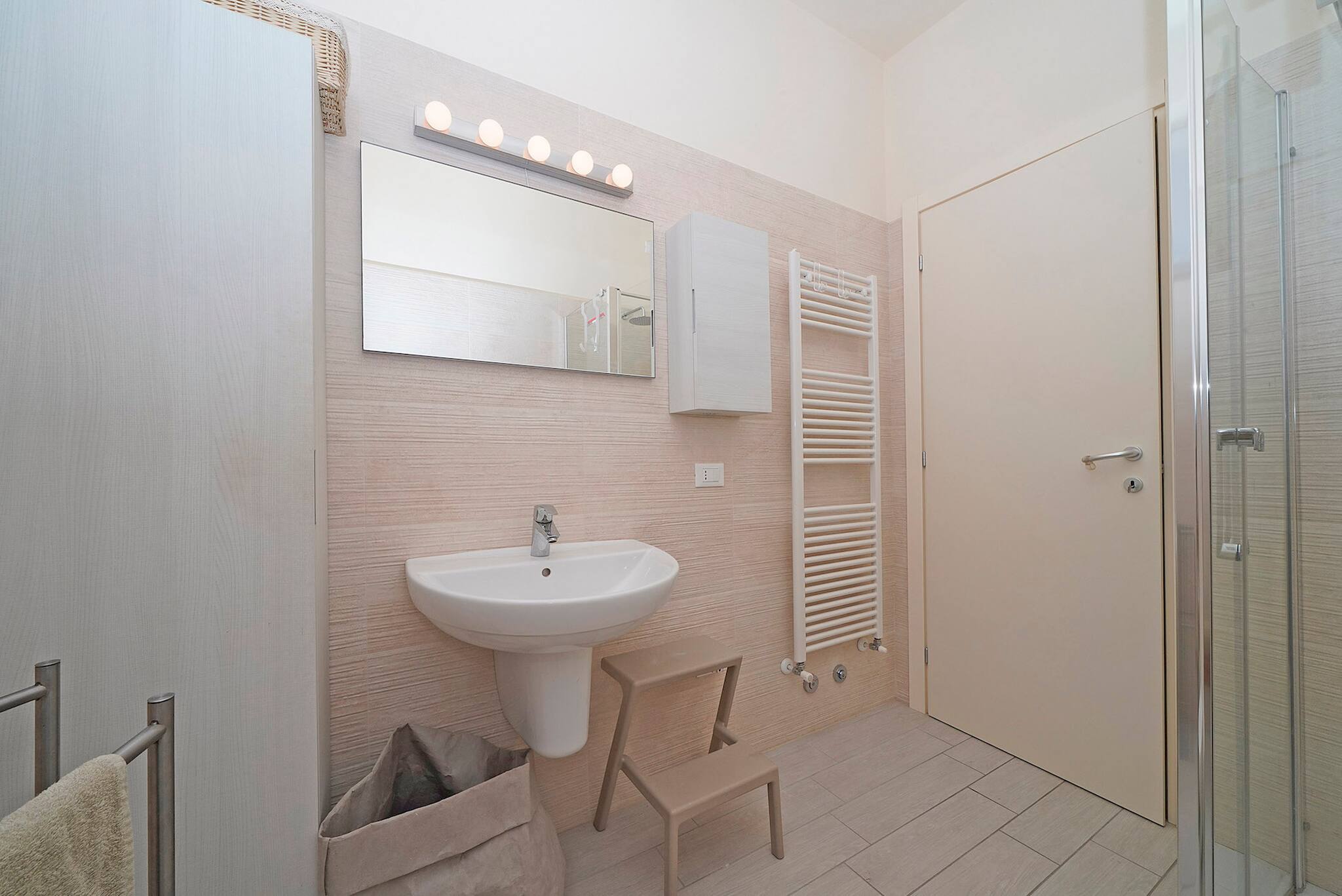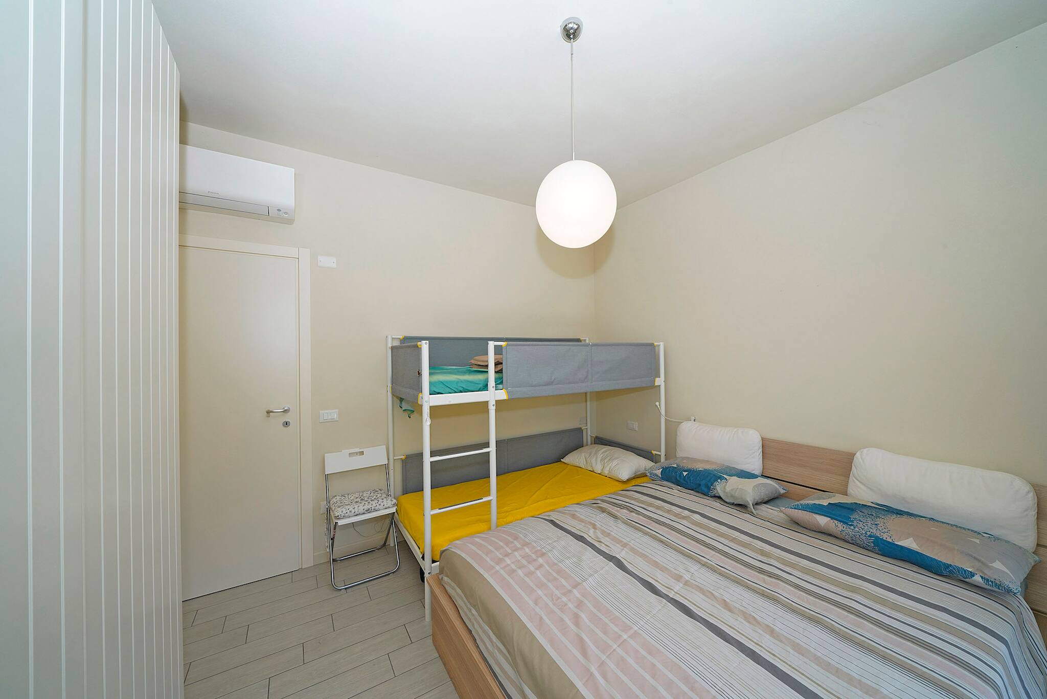 Next to the living room you can access the double bedroom with a large French window that communicates with the private balcony. Next to the room, there is access to the windowed bathroom equipped with shower, toilet, bidet and washing machine.