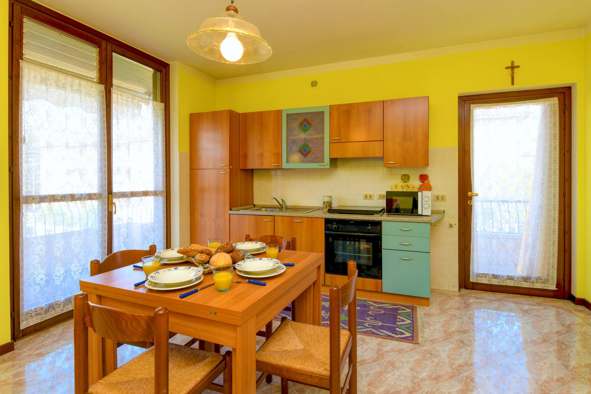 With entrance to the first floor, upon entering we immediately find the living area and the kitchen in the same harmonious environment equipped with a sofa bed with wall-mounted flat-screen TV and a fully equipped kitchen with an extendable table for up to 6 people.