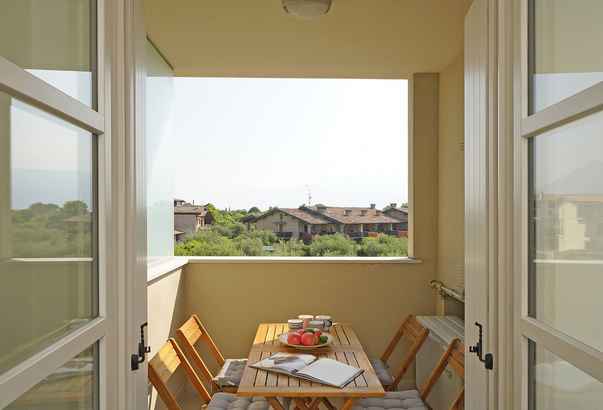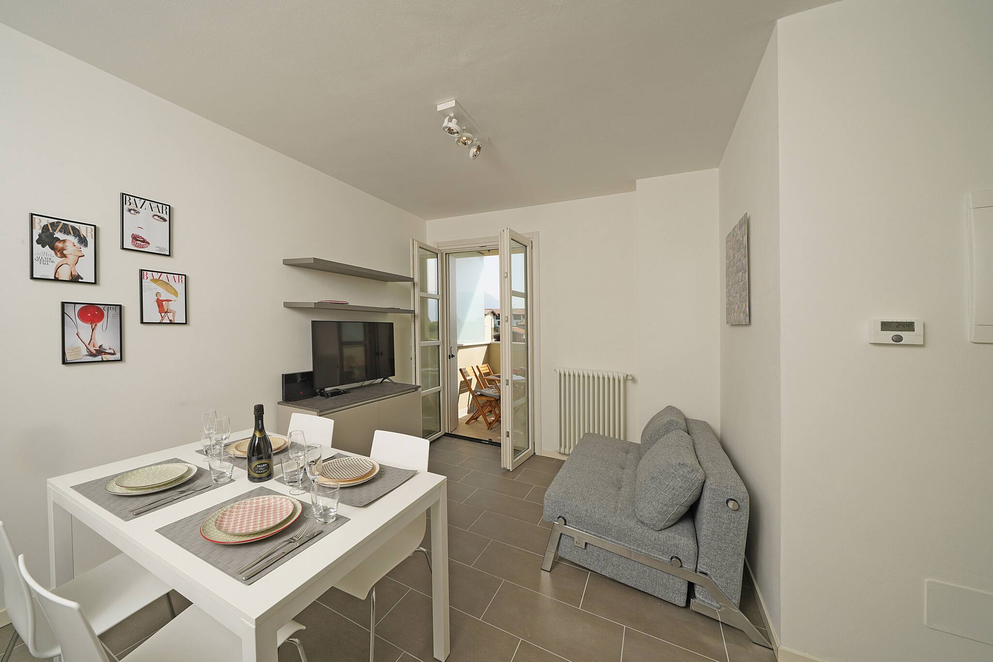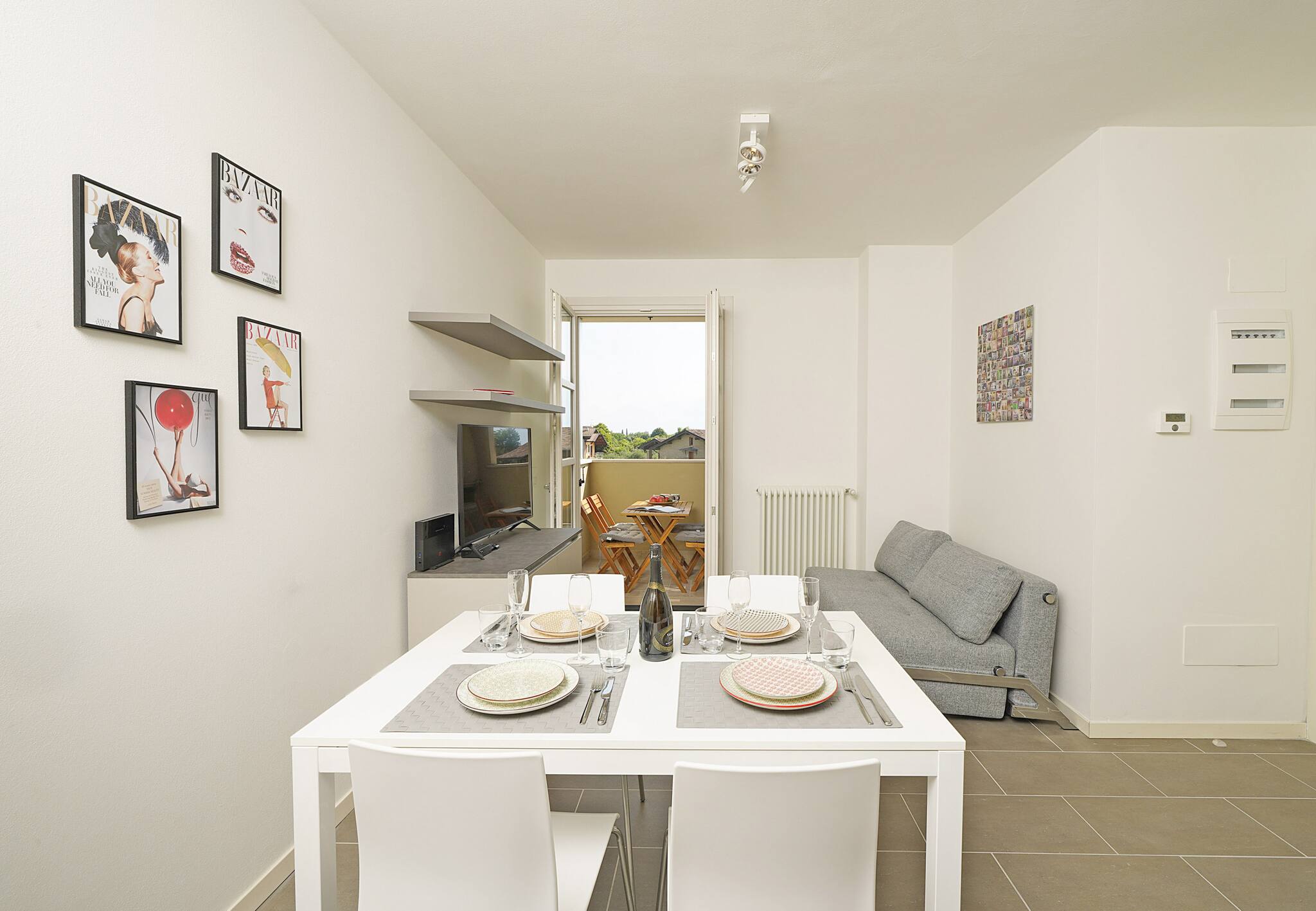 Flat on the second floor with elevator. Living room with halley view: french sofa bed and dining table for four people. Direct access to the small balcony equipped with table and chairs. Induction kitchen: fridge with freezer, crockery and cookware, dishwasher, microwave, coffee maker, kettle, toaster. 1 bathroom: washbasin, bidet, shower. 1 bedroom: double bed with wardrobe and window-door . YES air conditioning in living room. NO washing machine. Wifi: included .
