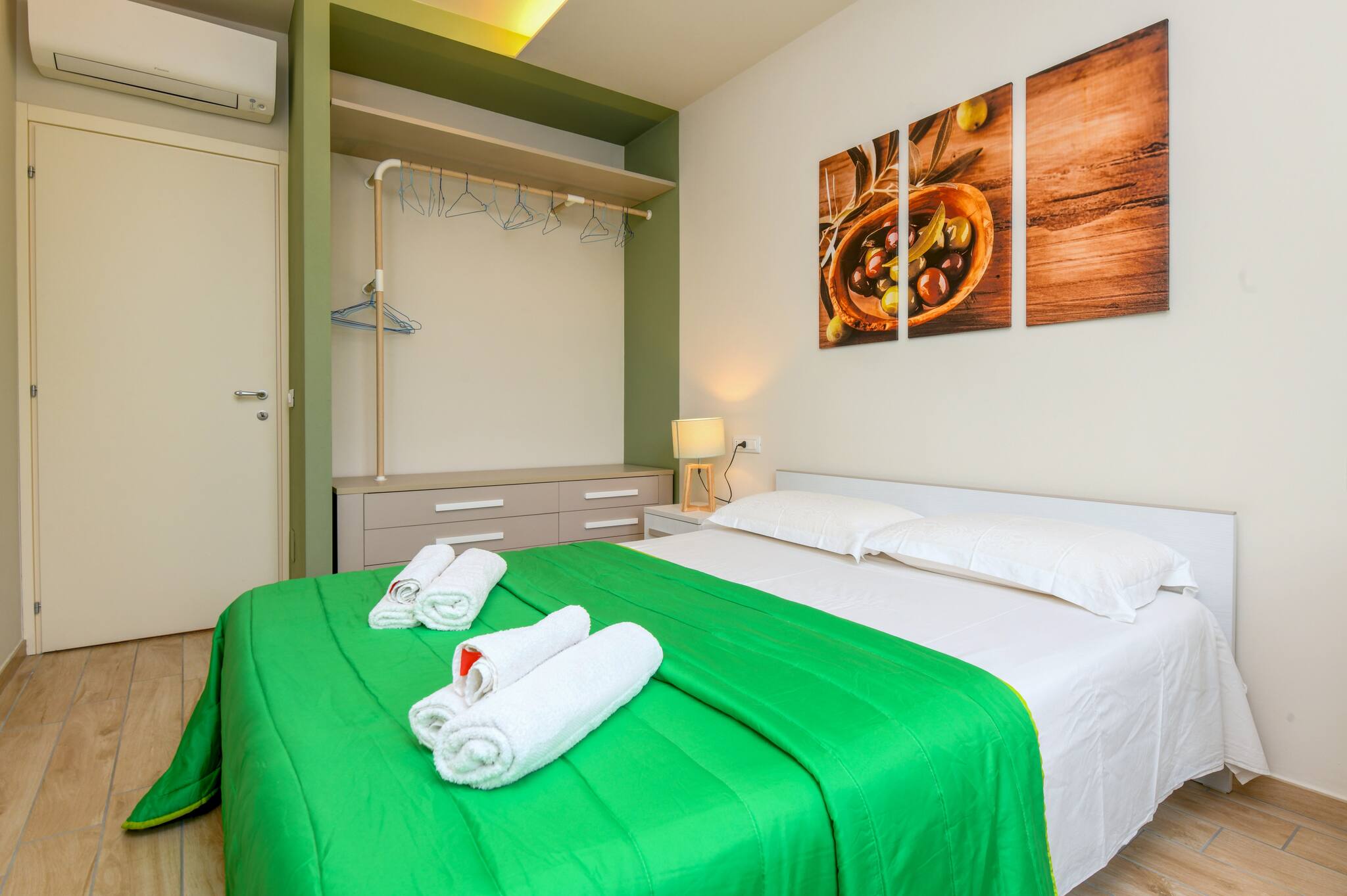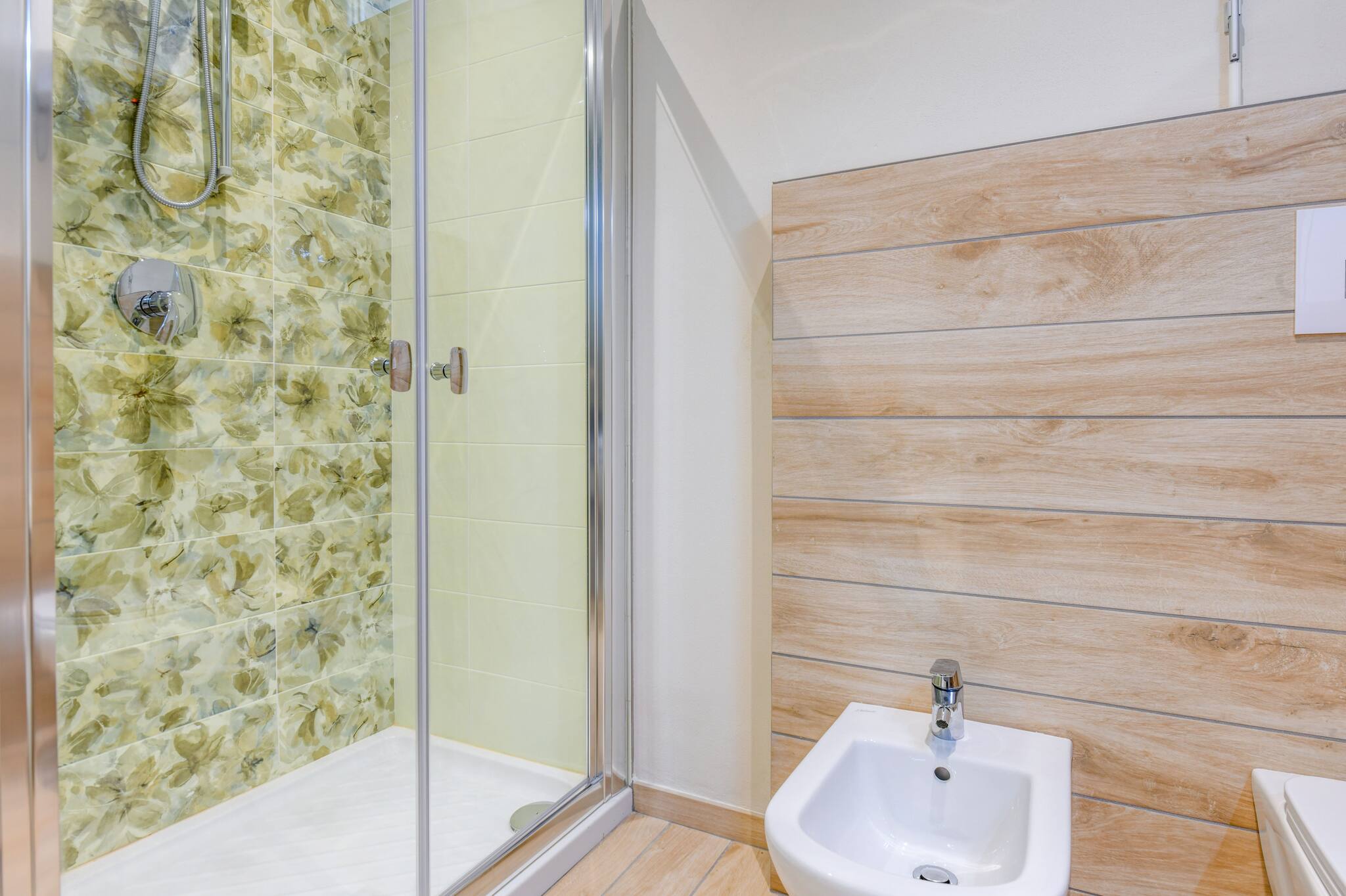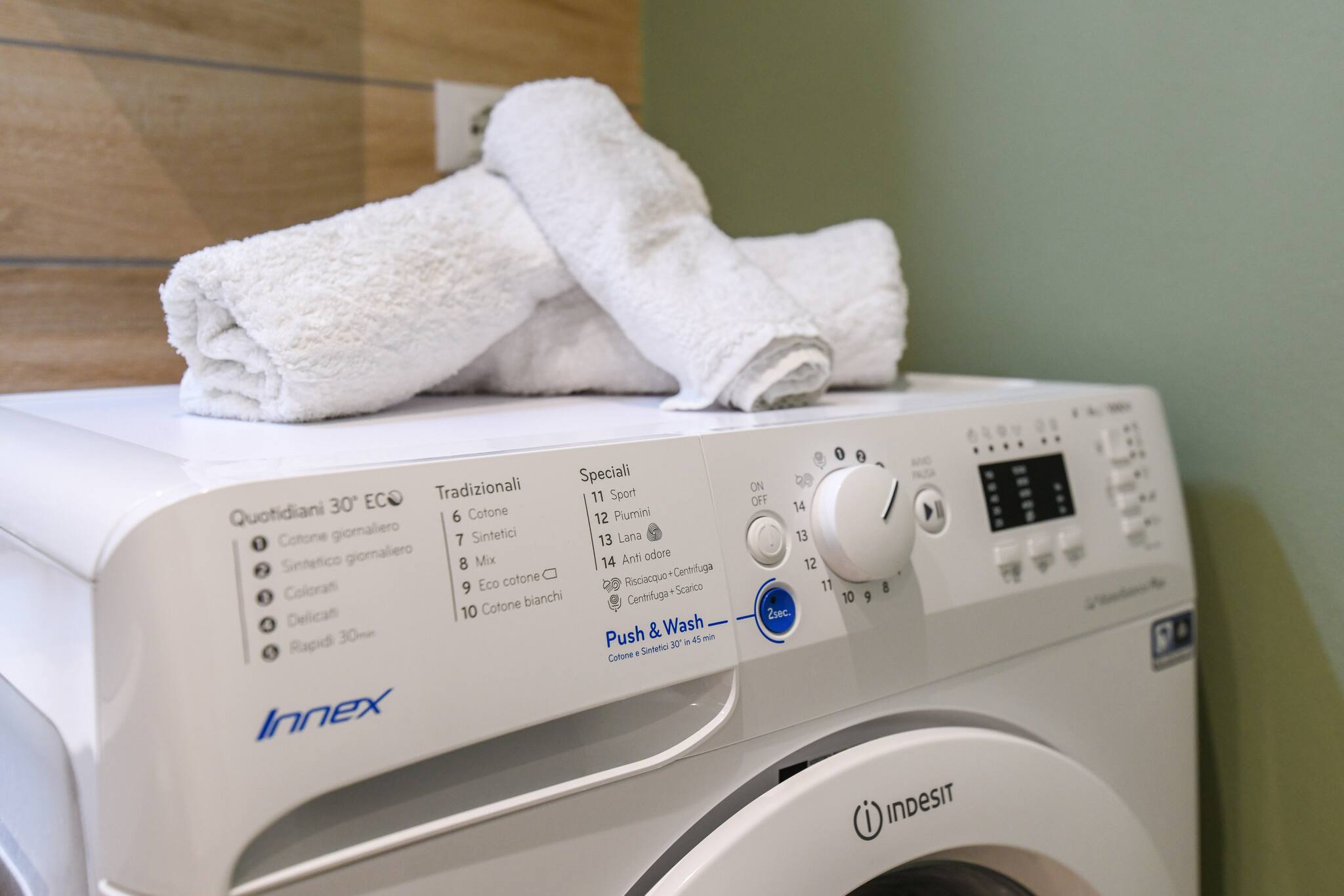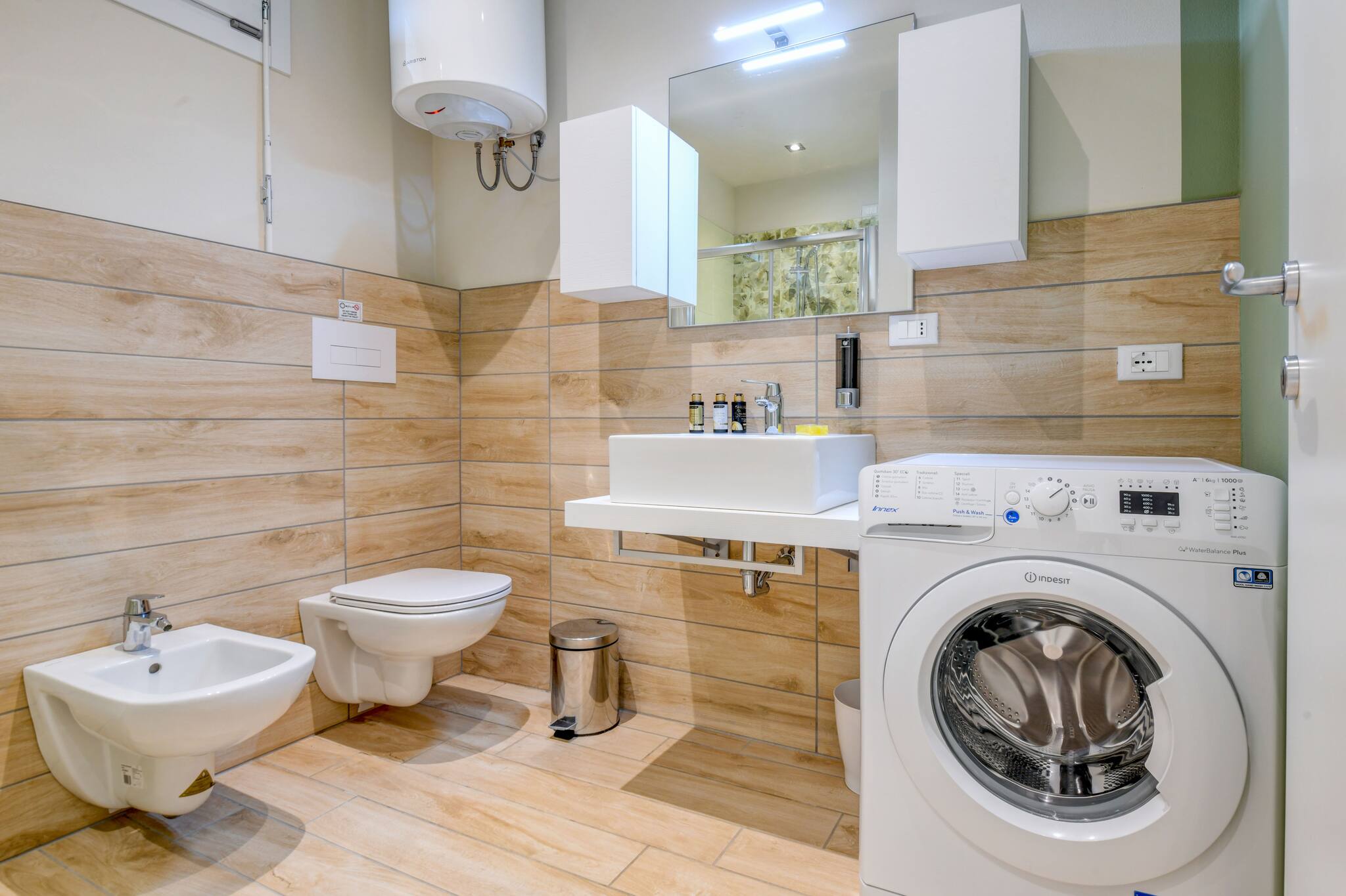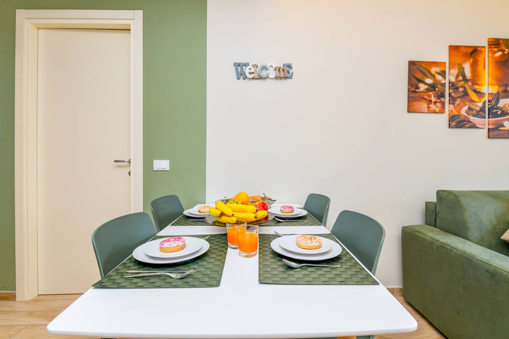 The flat, with Wi-Fi internet connection included, is located on the second floor and welcomes guests with a spacious and bright living room equipped with a double sofa bed, dining table and chairs, flat screen TV with international SAT channels, fully equipped kitchen with stove, fridge, freezer, microwave, dishwasher, electric kettle, coffee maker, citrus juicer and toaster. The living room overlooks the flat's private balcony.