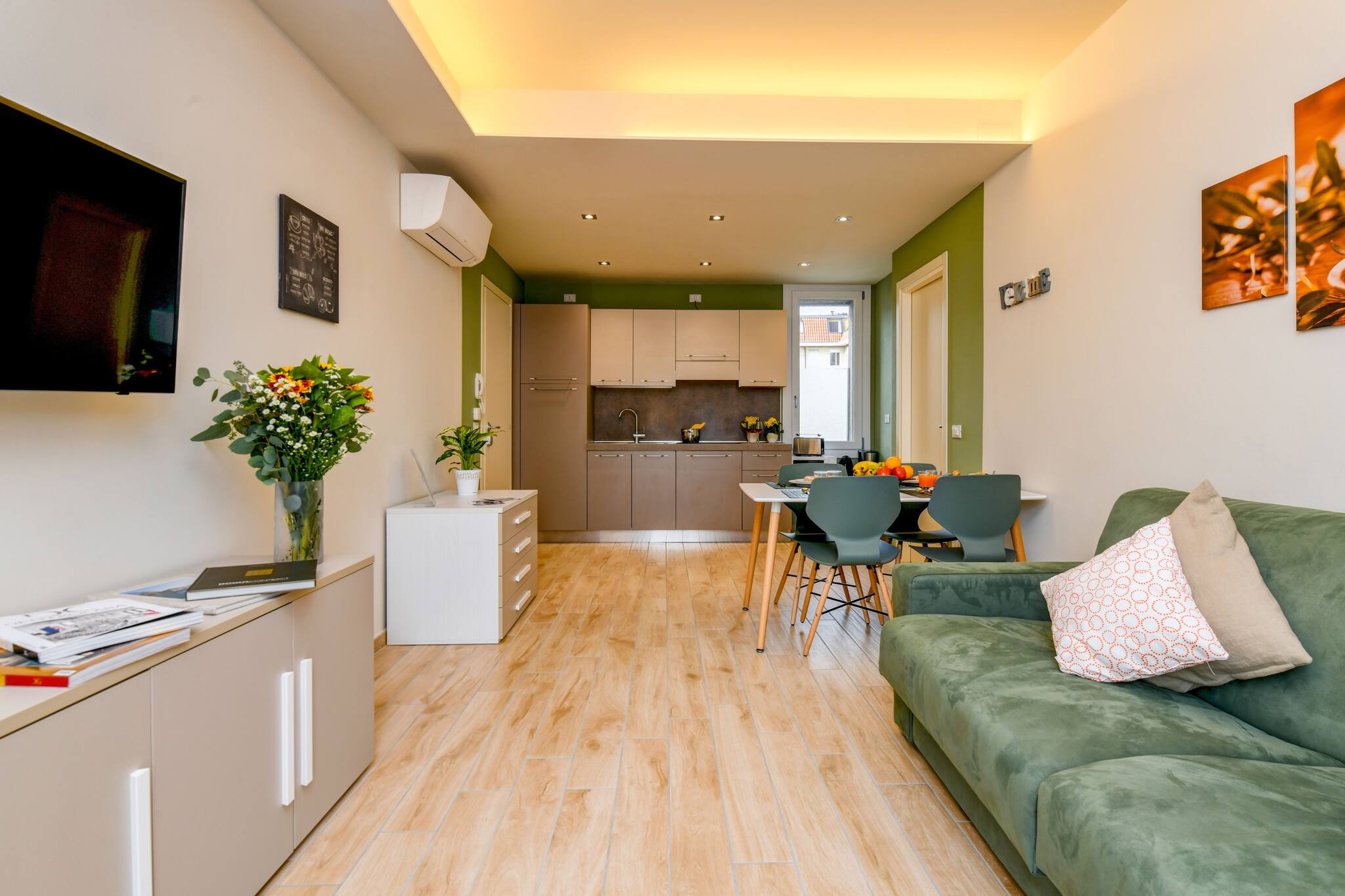 The spaces are in one room but distinct: on one side the living room with sofa and flat screen TV and on the other side the fully equipped kitchen and the elegant and comfortable dining table.