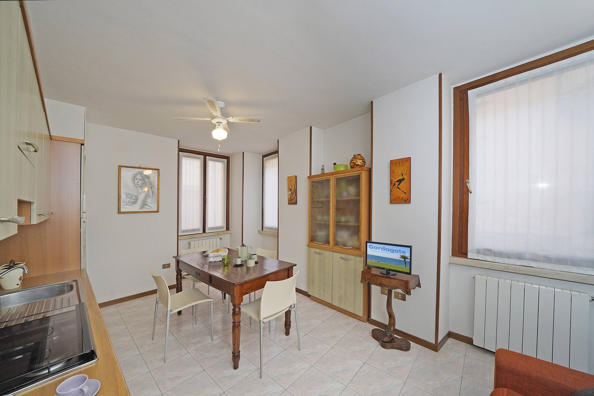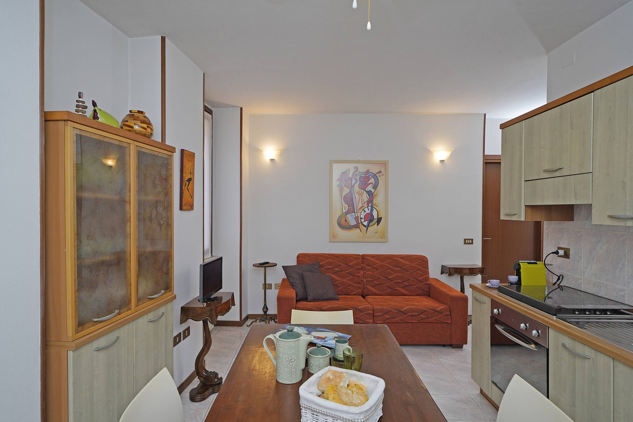 The spaces are in one room but distinct: on one side the living room with sofa and flat screen TV and on the other side the fully equipped kitchen and the elegant and comfortable dining table.