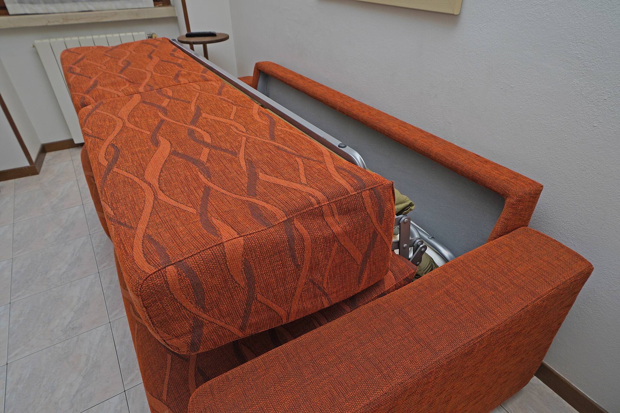 The flat, with Wi-Fi internet connection included, is located on the second floor and welcomes guests with a spacious and bright living room equipped with a double sofa bed, dining table and chairs, flat screen TV with international SAT channels, fully equipped kitchen with stove, fridge, freezer, microwave, dishwasher, electric kettle, coffee maker, citrus juicer and toaster. The living room overlooks the flat's private balcony.