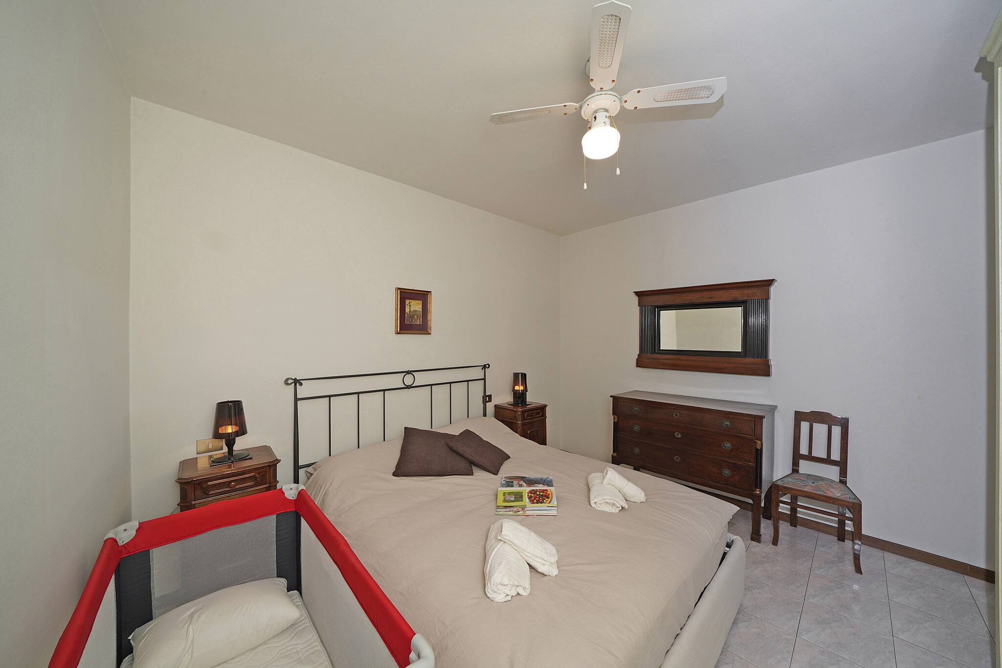 Proceeding towards the sleeping area you will find the two large double bedrooms, also furnished in the style of the house and then the bathroom with bathtub, shower, sink and toilet.