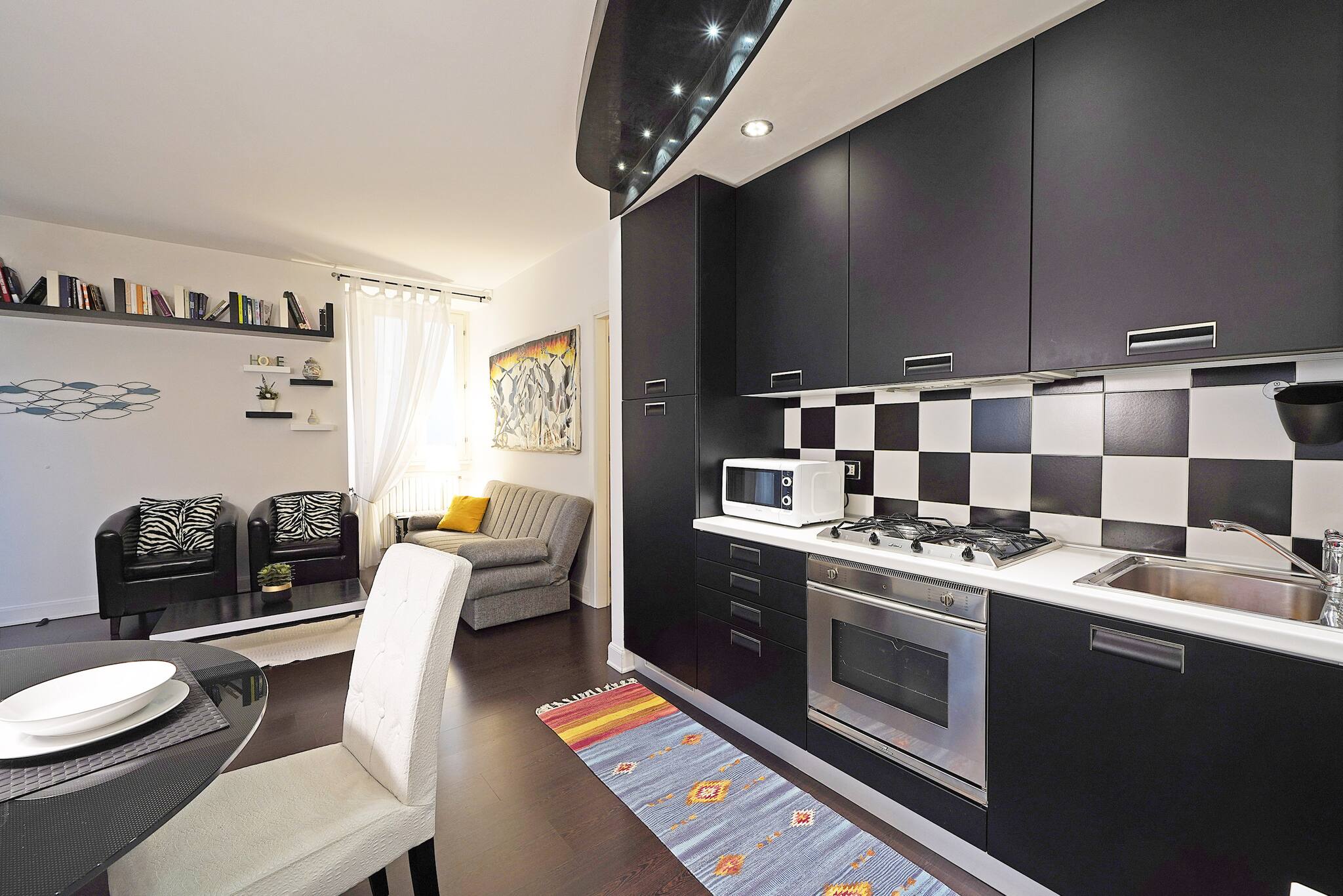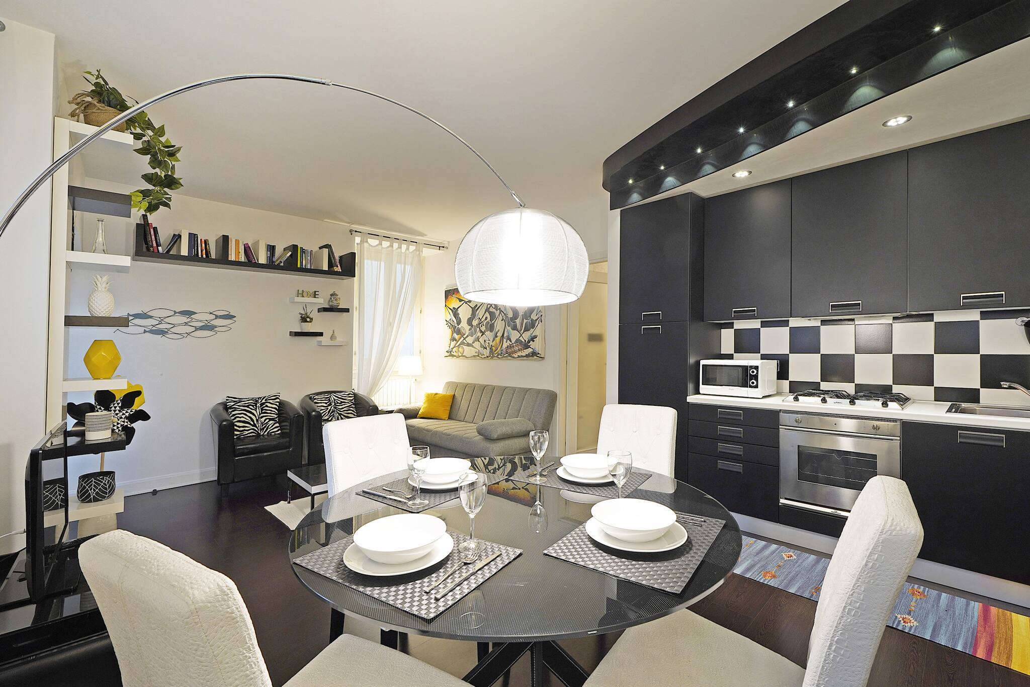 The spaces are in one room but distinct: on one side the living room with sofa and flat screen TV and on the other side the fully equipped kitchen and the elegant and comfortable dining table.