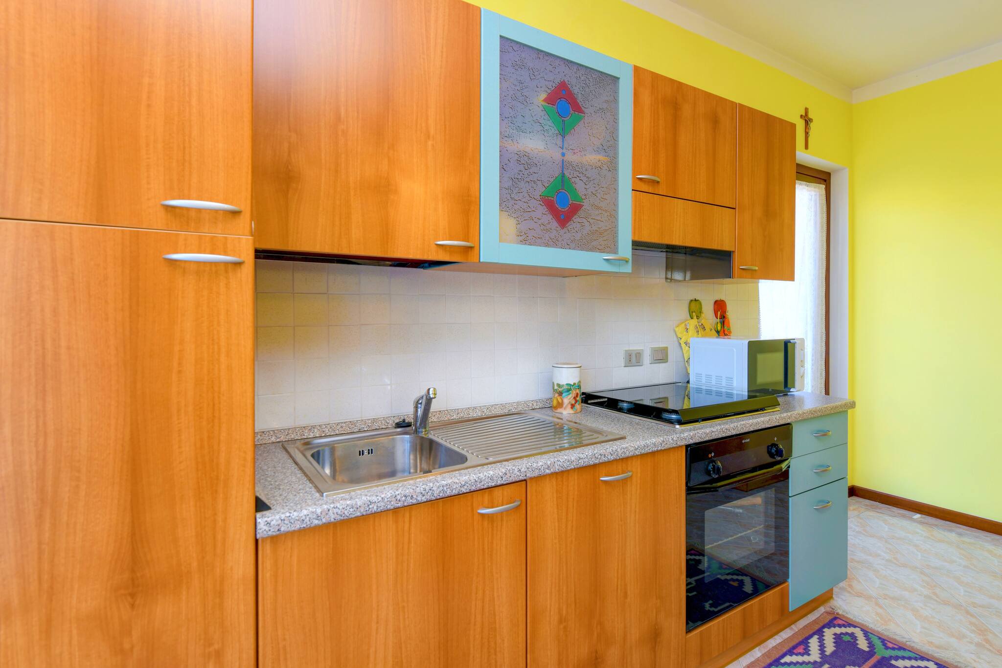 With entrance to the first floor, upon entering we immediately find the living area and the kitchen in the same harmonious environment equipped with a sofa bed with wall-mounted flat-screen TV and a fully equipped kitchen with an extendable table for up to 6 people.
