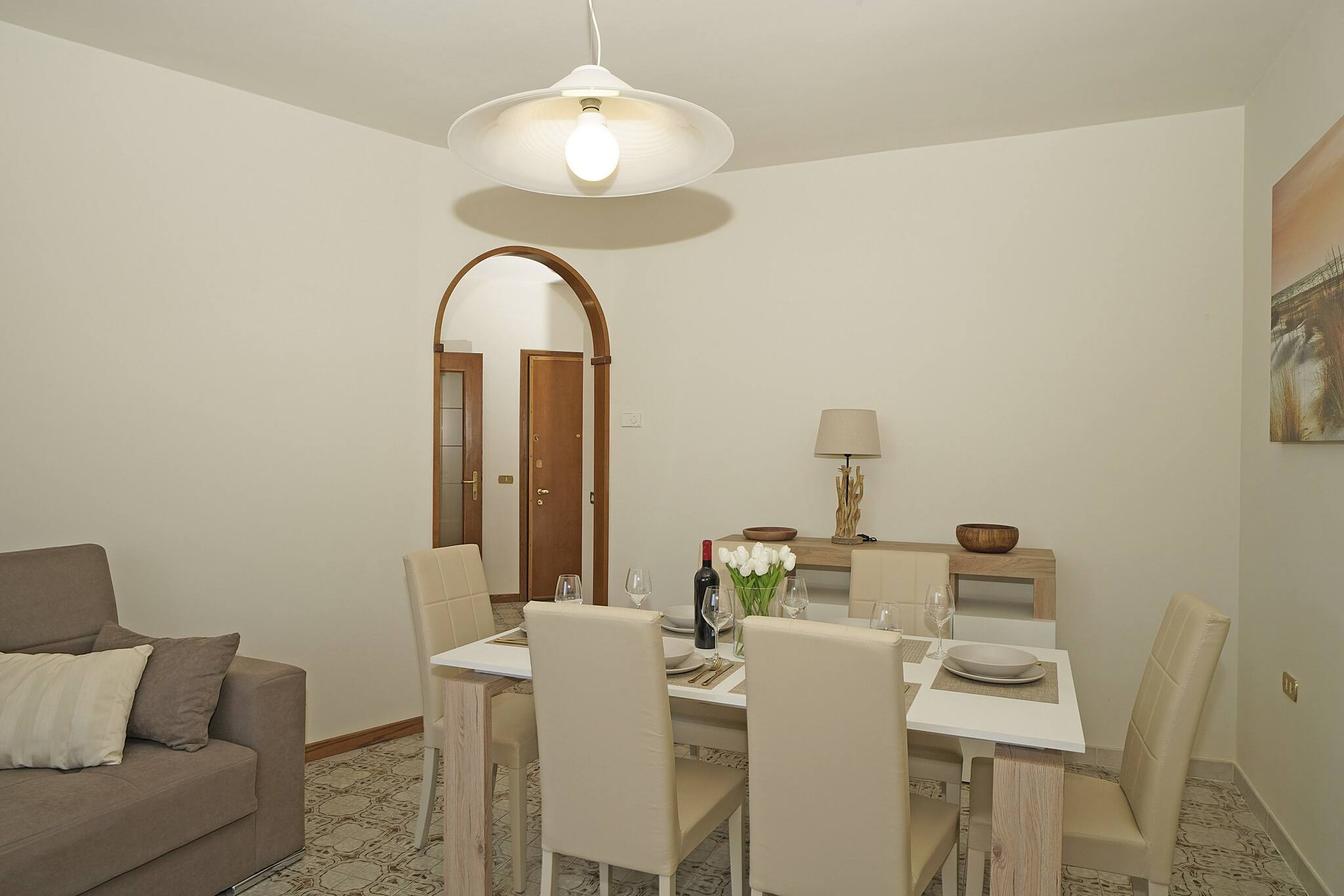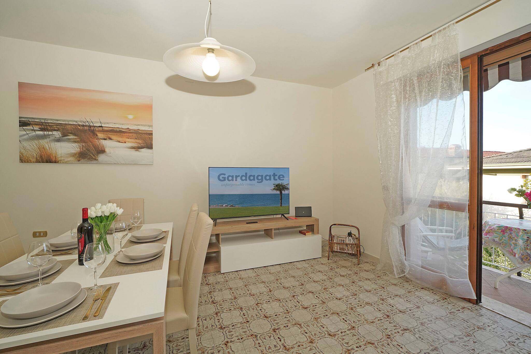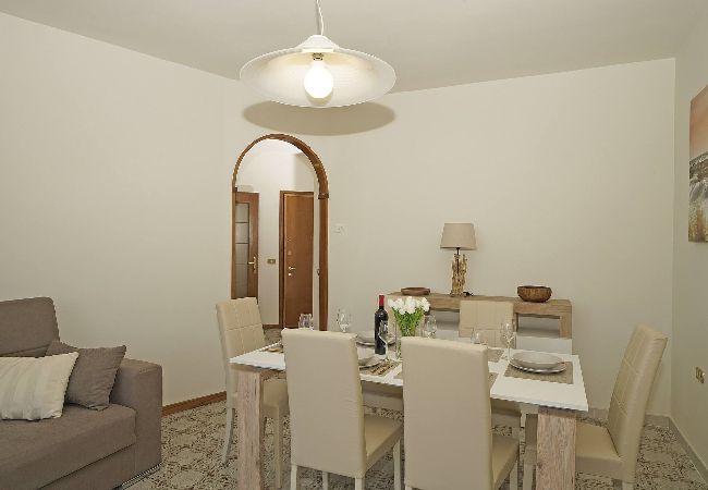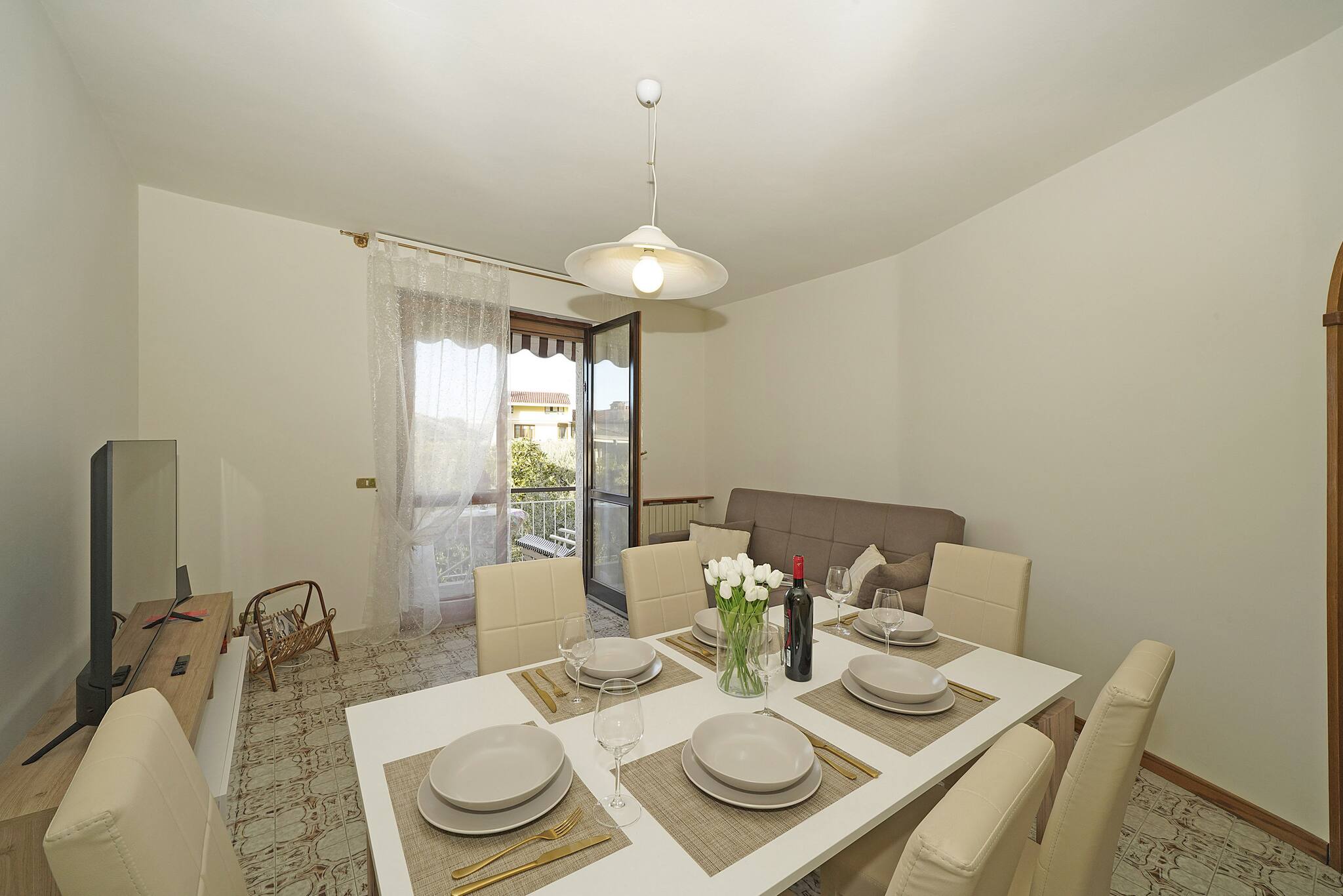 Flat on the first floor. Spacious living room: large double sofa bed, t and dining table. Direct access to small balcony equipped with table and chairs. Separate induction kitchen: fridge with freezer, crockery and cookware, dishwasher, oven, microwave, kettle. 1 bathroom: washbasin, bidet, shower. 1st bedroom: double bed with wardrobe, French window opening onto balcony.2nd bedroom: double bed with wardrobe, French window opening onto balcony. No air conditioning. Wifi: included.