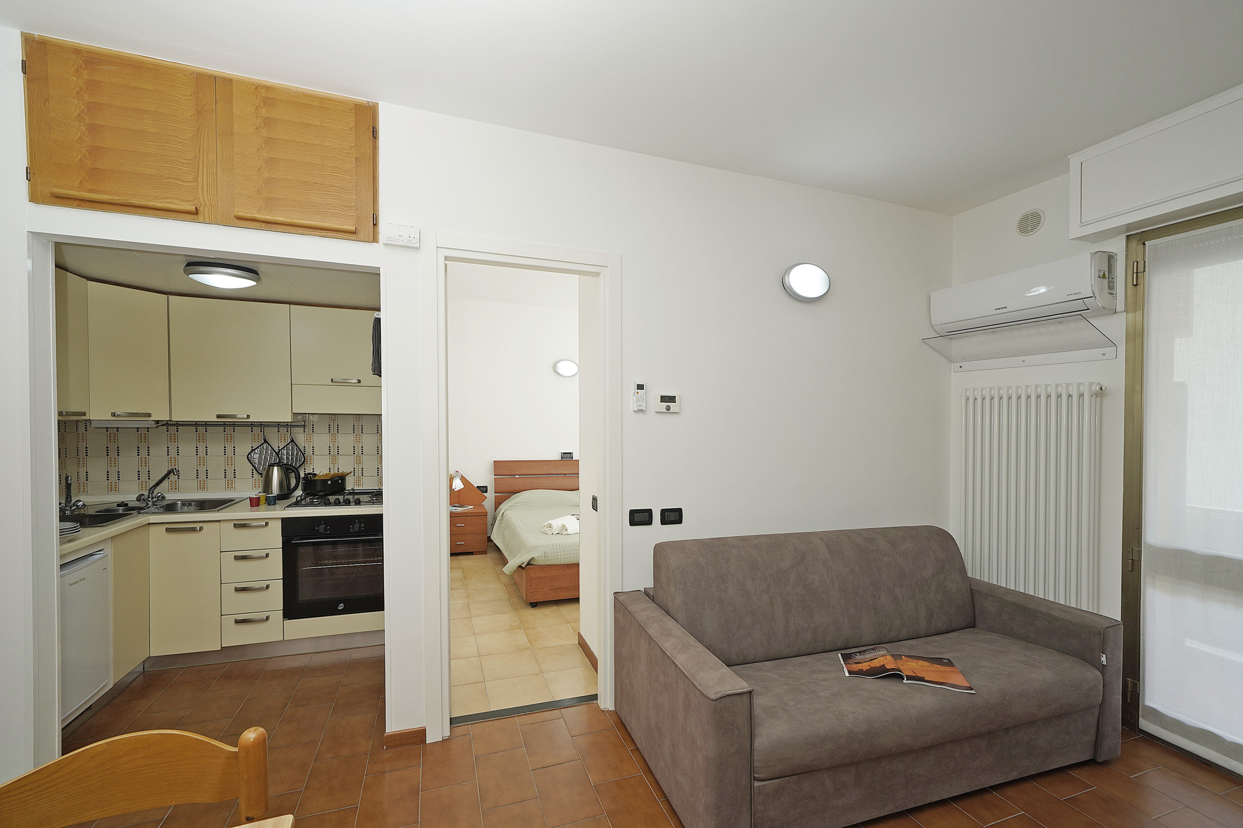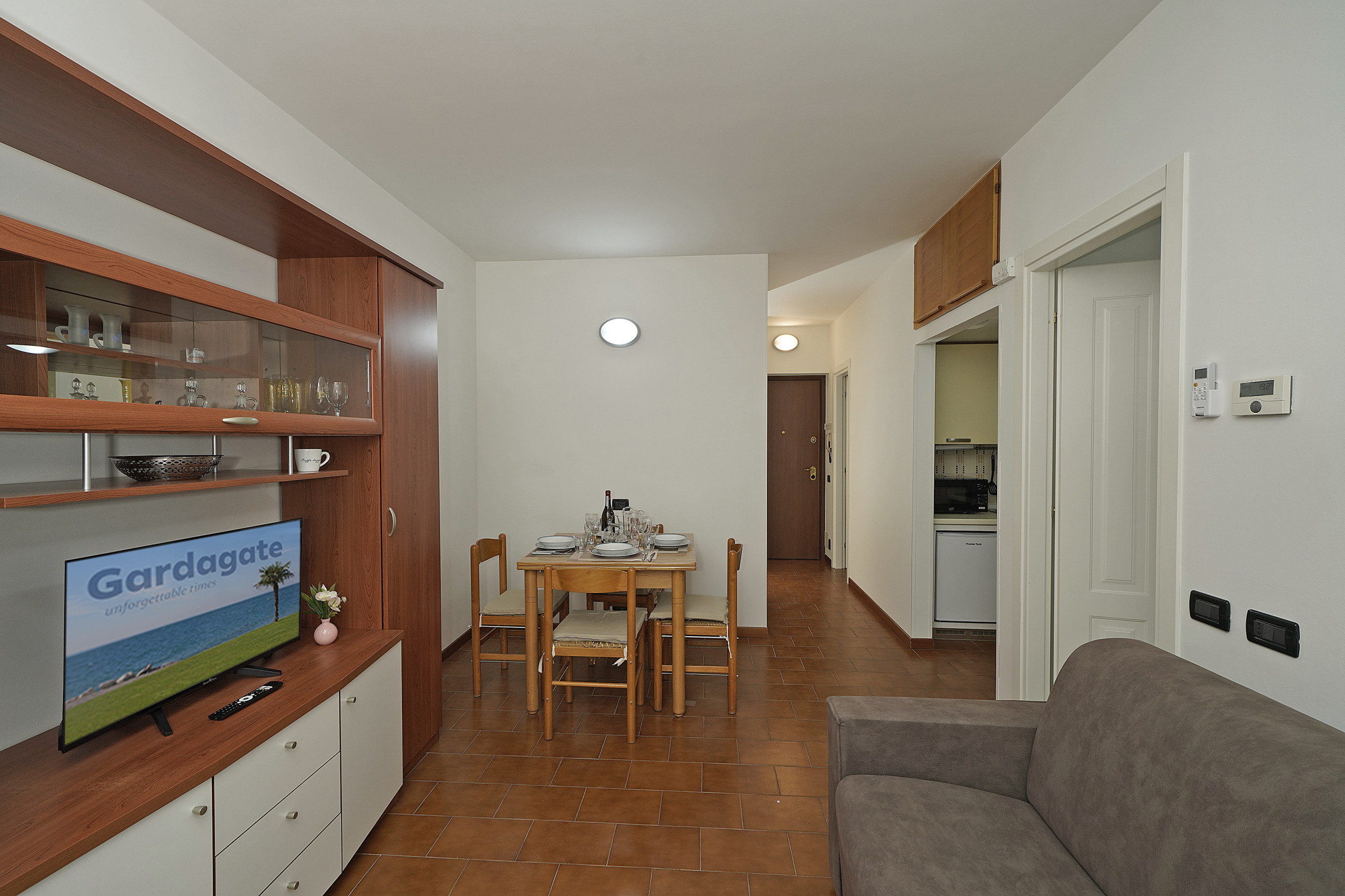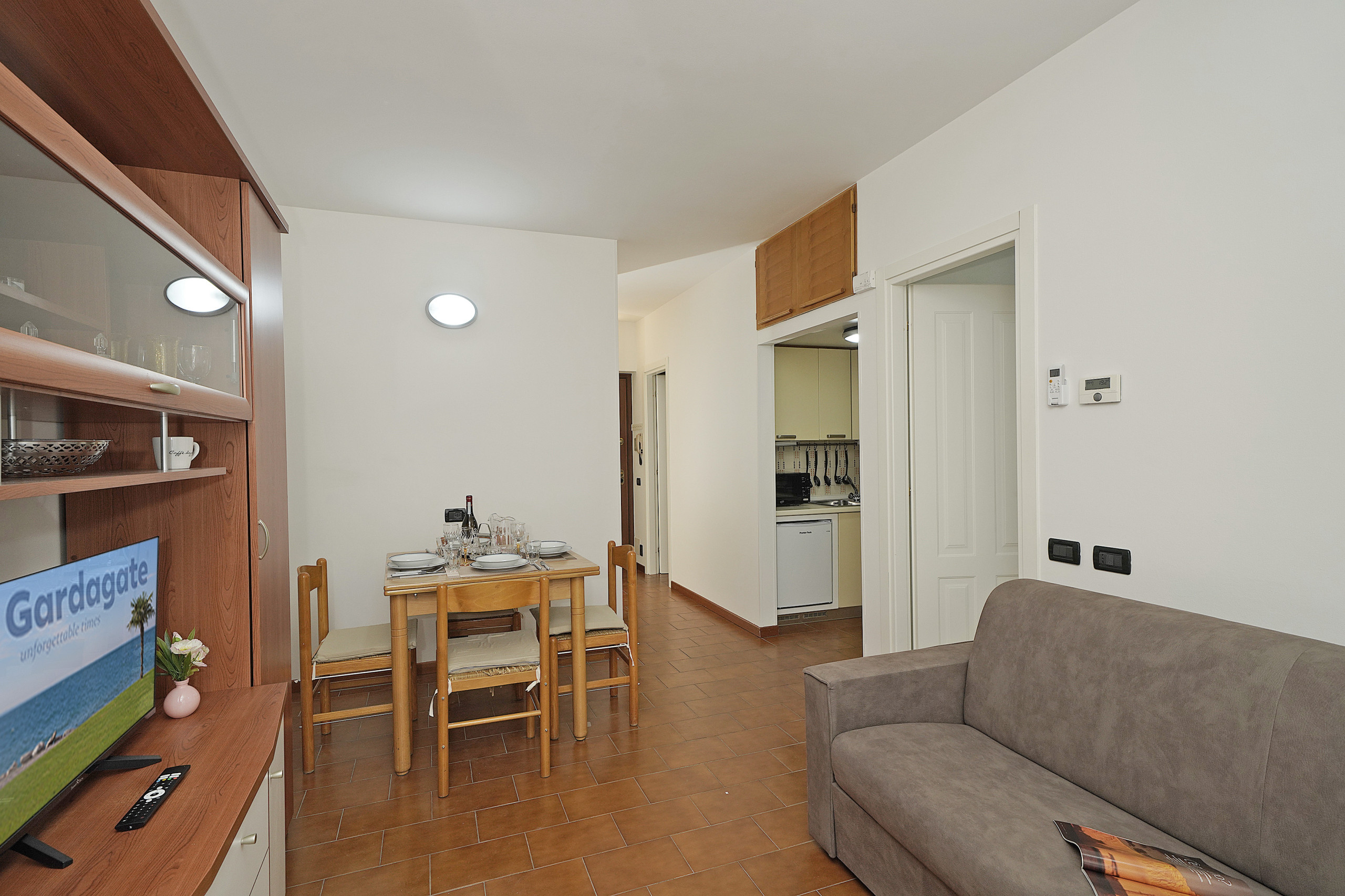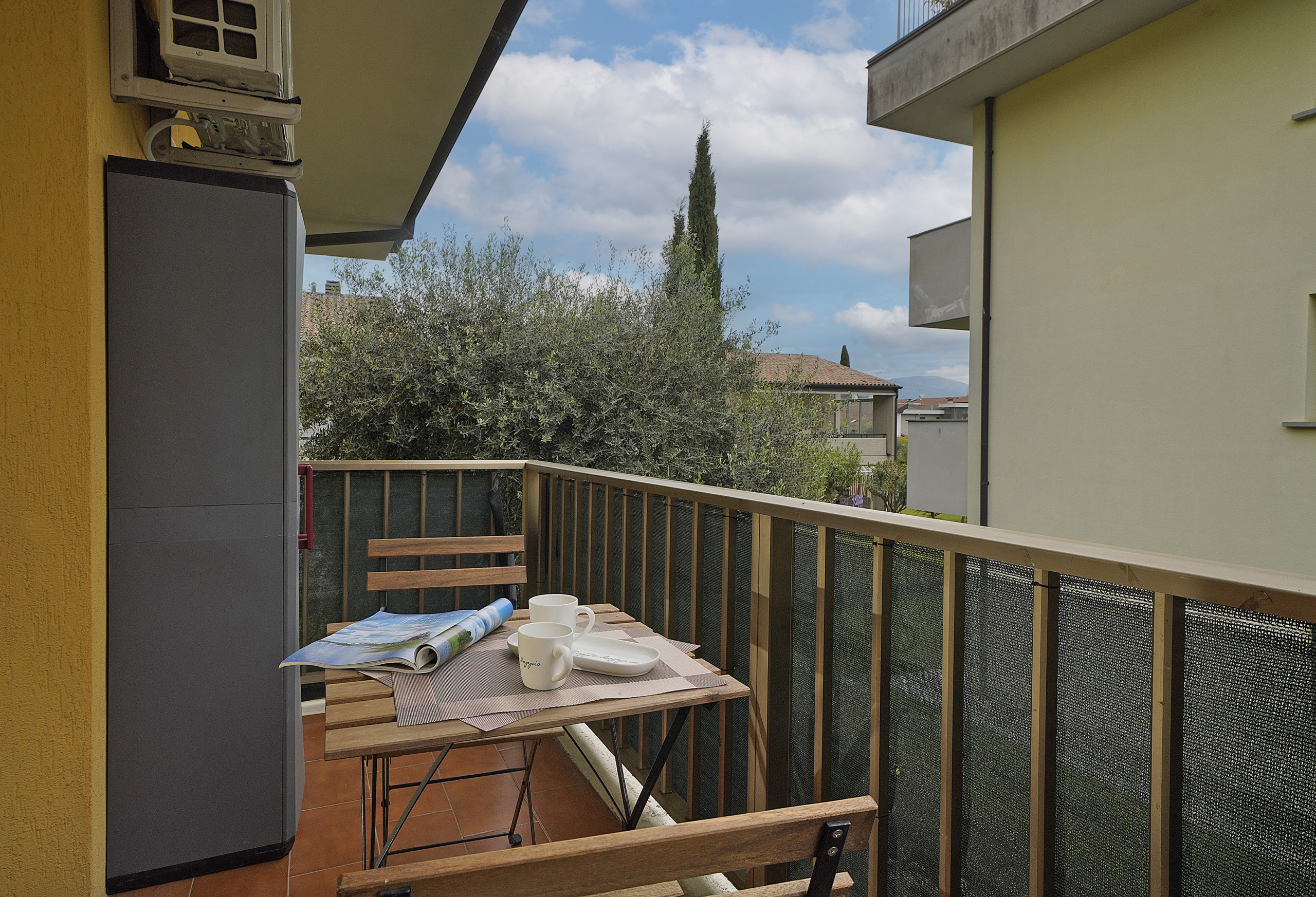 The apartment has a living room with a pull-out sofa bed, a bedroom with a comfortable double bed, a fully equipped open kitchen and a bathroom with a shower. Enjoy every comfort in the apartment: balcony with a view of the olive trees and partly of Lake Garda, air conditioning and heating, lift, internet/WLAN connection, TV, washing machine, iron/ironing board and hairdryer. The open kitchen with induction hob is equipped with a fridge, microwave, oven, freezer, dishwasher, crockery/cutlery, kitchen utensils, coffee machine, toaster and kettle. For your relaxing holiday, you have access to the beautiful swimming pool with a dedicated children's area. The highlight of this apartment is access to the large 500 sqm roof solarium terrace, exclusively reserved for a few apartments, with a magnificent 360-degree view of Lake Garda. There is also a hot tub on the terrace. The complex is just a stone's throw from the lakeside promenade. You can park your car in the private underground garage. The garage accommodates cars of normal size, SUVs or large cars do not fit. Supermarkets, restaurants, ice cream parlours, bank, post office, etc. are within walking distance.