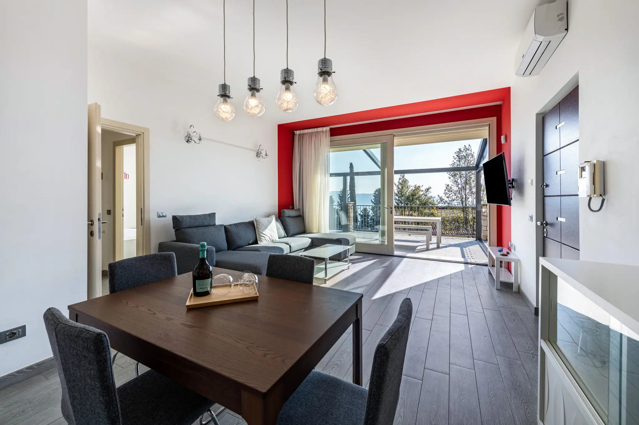 The living area, bright and welcoming, opens onto a panoramic terrace perfect for starting the day with a lake view breakfast or relaxing at sunset. The American gas kitchen is fully equipped with a refrigerator, oven, freezer and dishwasher, as well as a coffee machine, toaster, kettle and all the necessary utensils to feel at home.