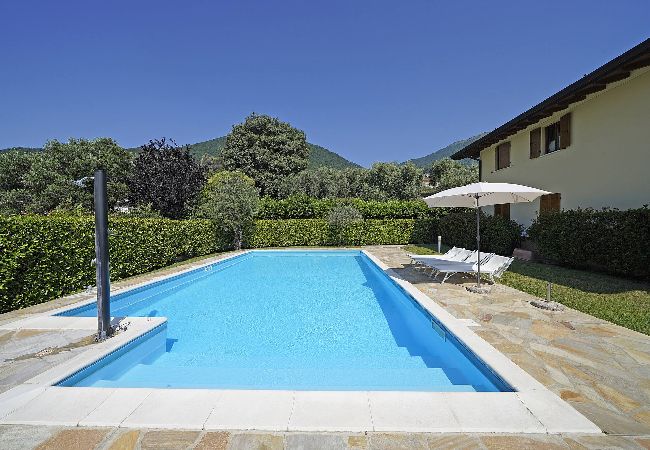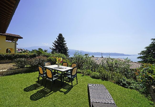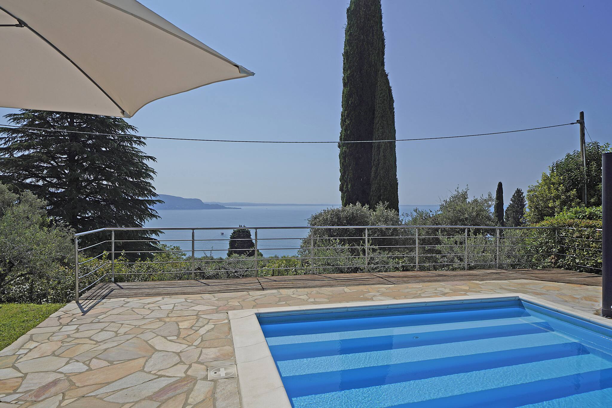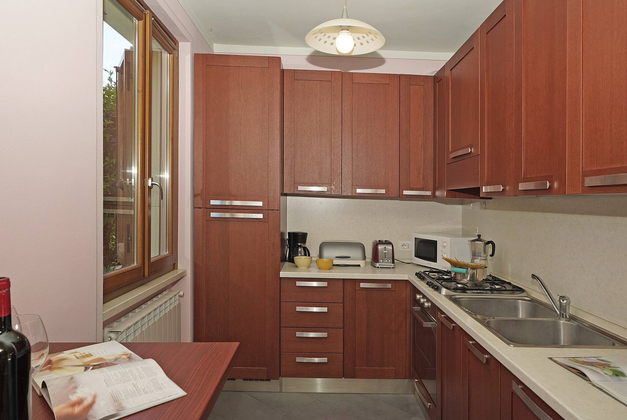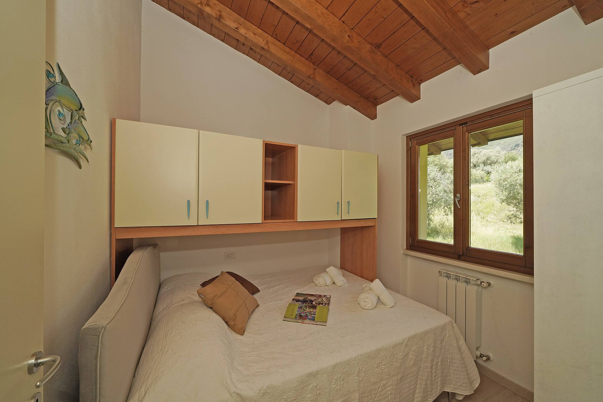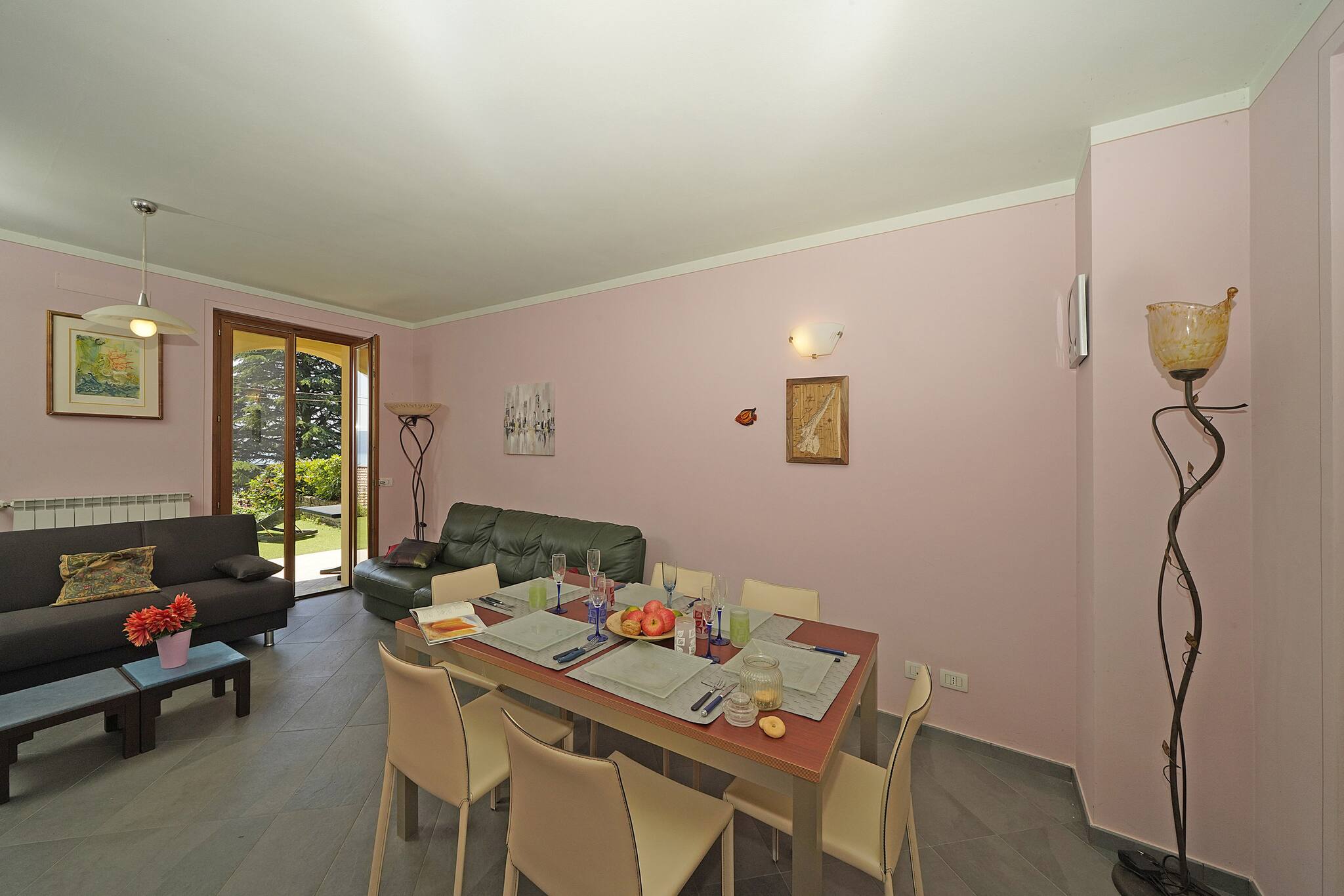 Ground floor villa. Living room: one sofa, stereo, dining table. Direct access to the lake view porch with private garden equipped with table and chairs. Hidden gas corner kitchen with small support table: fridge with freezer, crockery and pots, dishwasher, oven, microwave, American coffee machine, moka for Italian coffee, todpane. 1 bathroom with window: sink, bidet, shower.