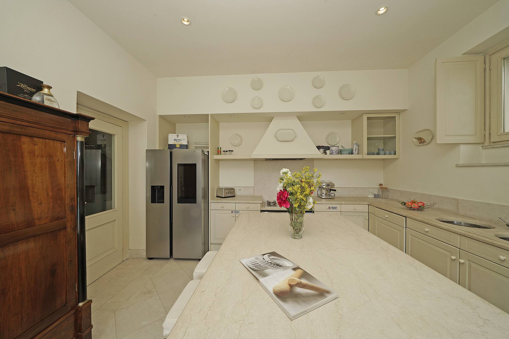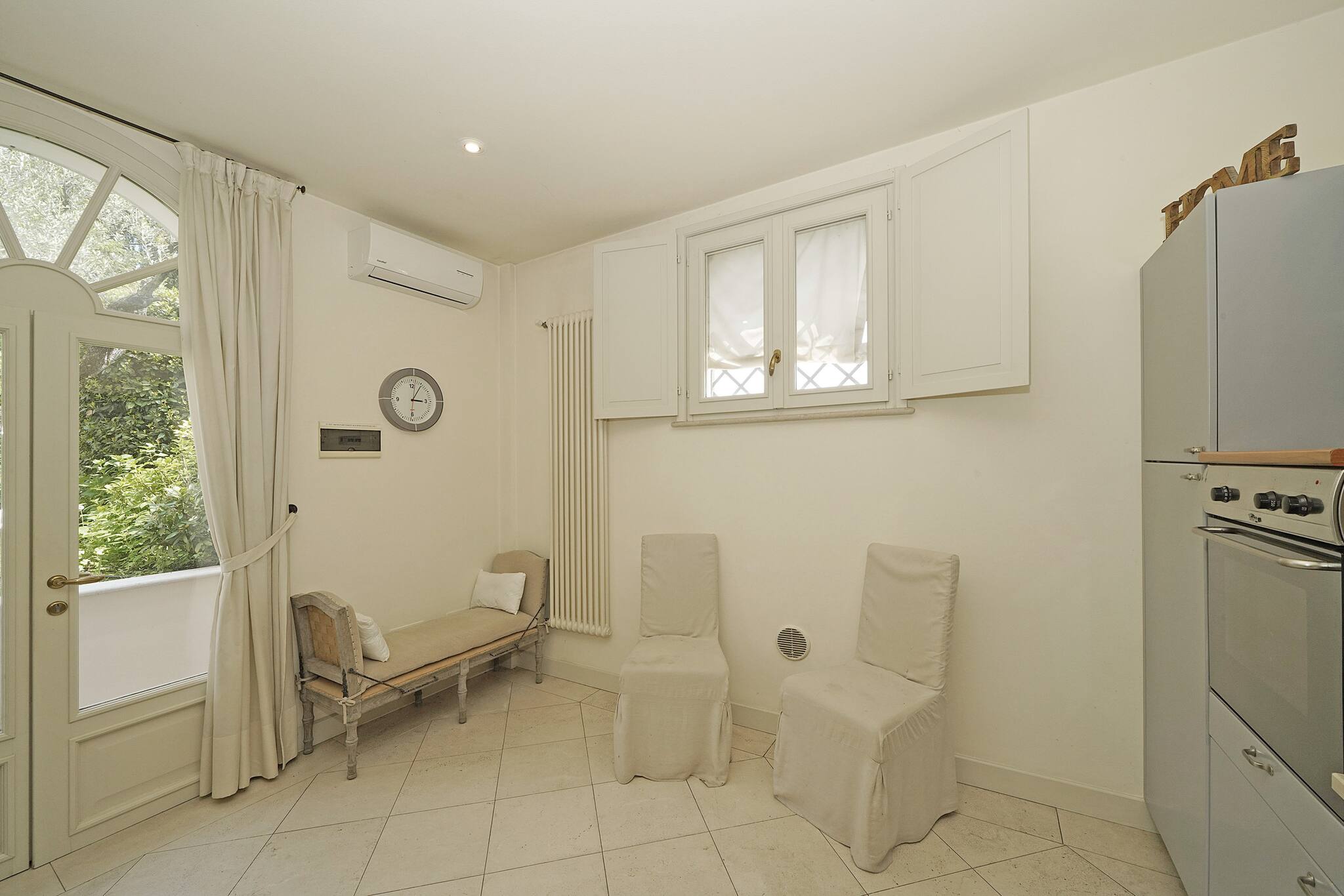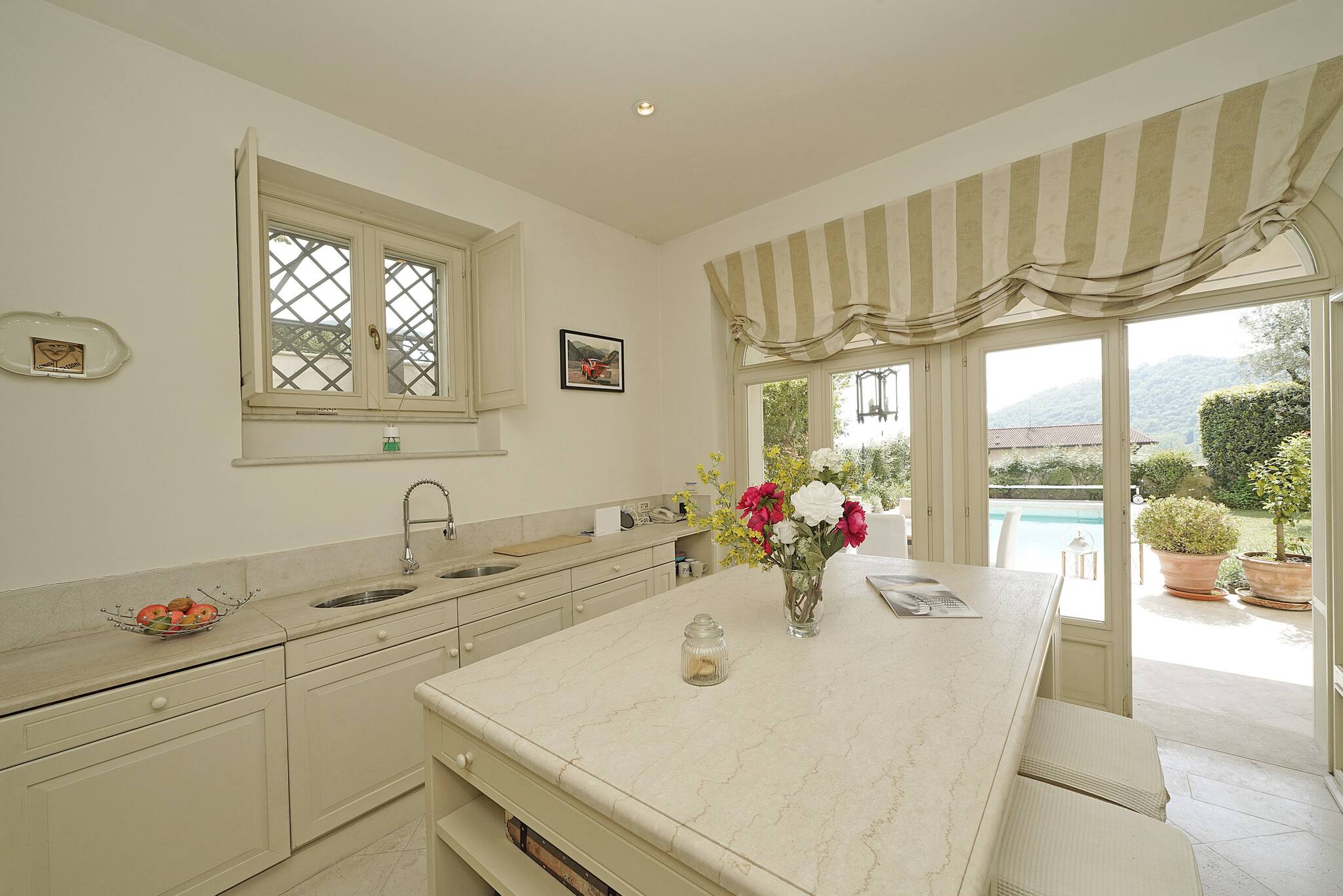 Going down the stairs, you access the actual ground floor with: a large separate kitchen fully equipped with a peninsula: dishwasher, oven, coffee machine, toaster, crockery; from the kitchen you directly access the porch equipped with dining table and chairs and the private swimming pool. Next to it, a small outdoor kitchen. On this same floor is the third separate bathroom with double washbasin, shower, toilet and bidet with a window door overlooking the garden. Continuing, you access a laundry area with washing machine. The villa then continues with an annex with air conditioning, connected but separate in spaces: it consists of a double bedroom, a private bathroom with toilet, bidet and double shower and a 2nd kitchen fully equipped with: oven, microwave, toaster, blender and professional bar coffee machine. Media: smart TV WiFi: included. 2 External private parking spaces within the property. EXTRA SERVICES: private chef on request for a fee