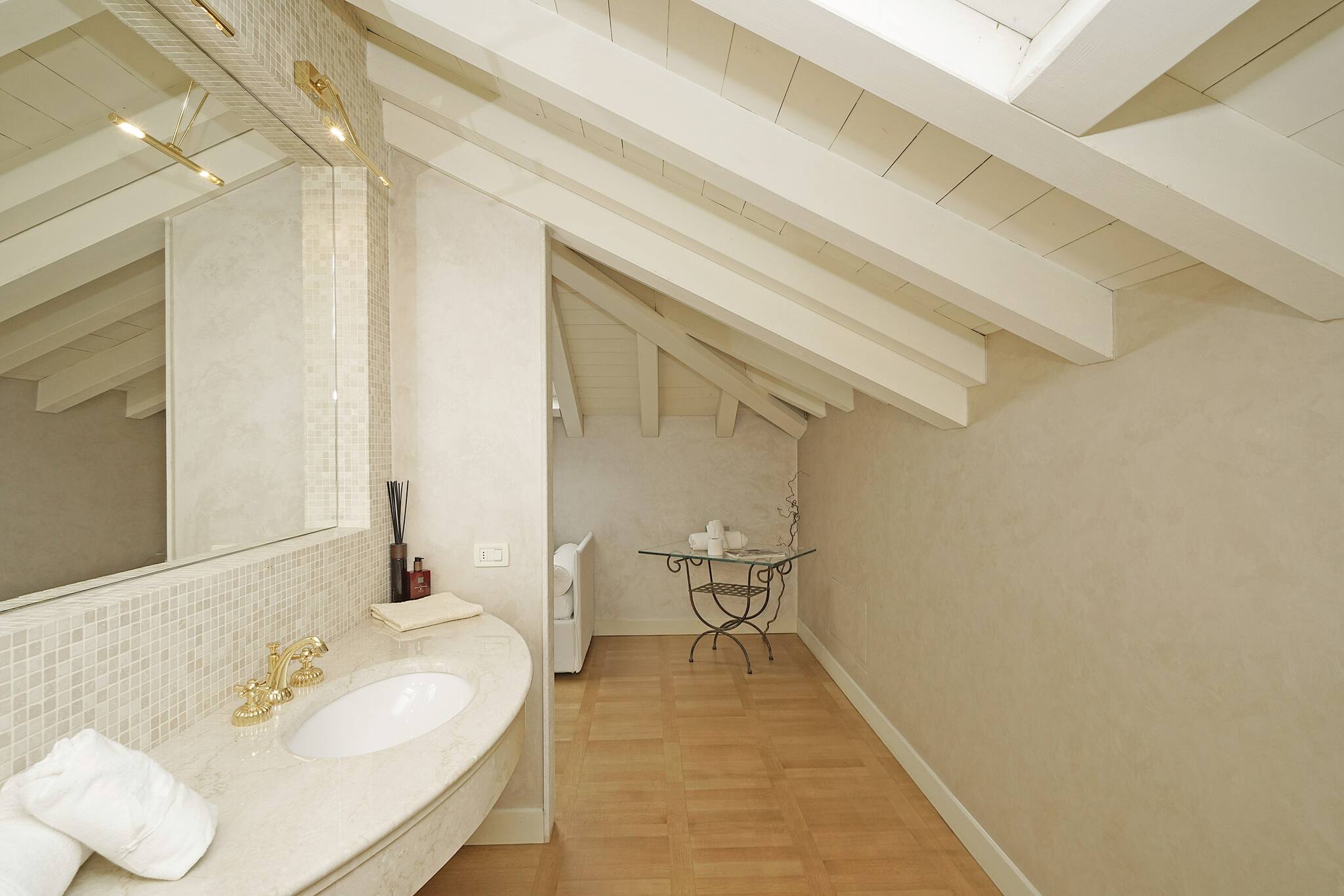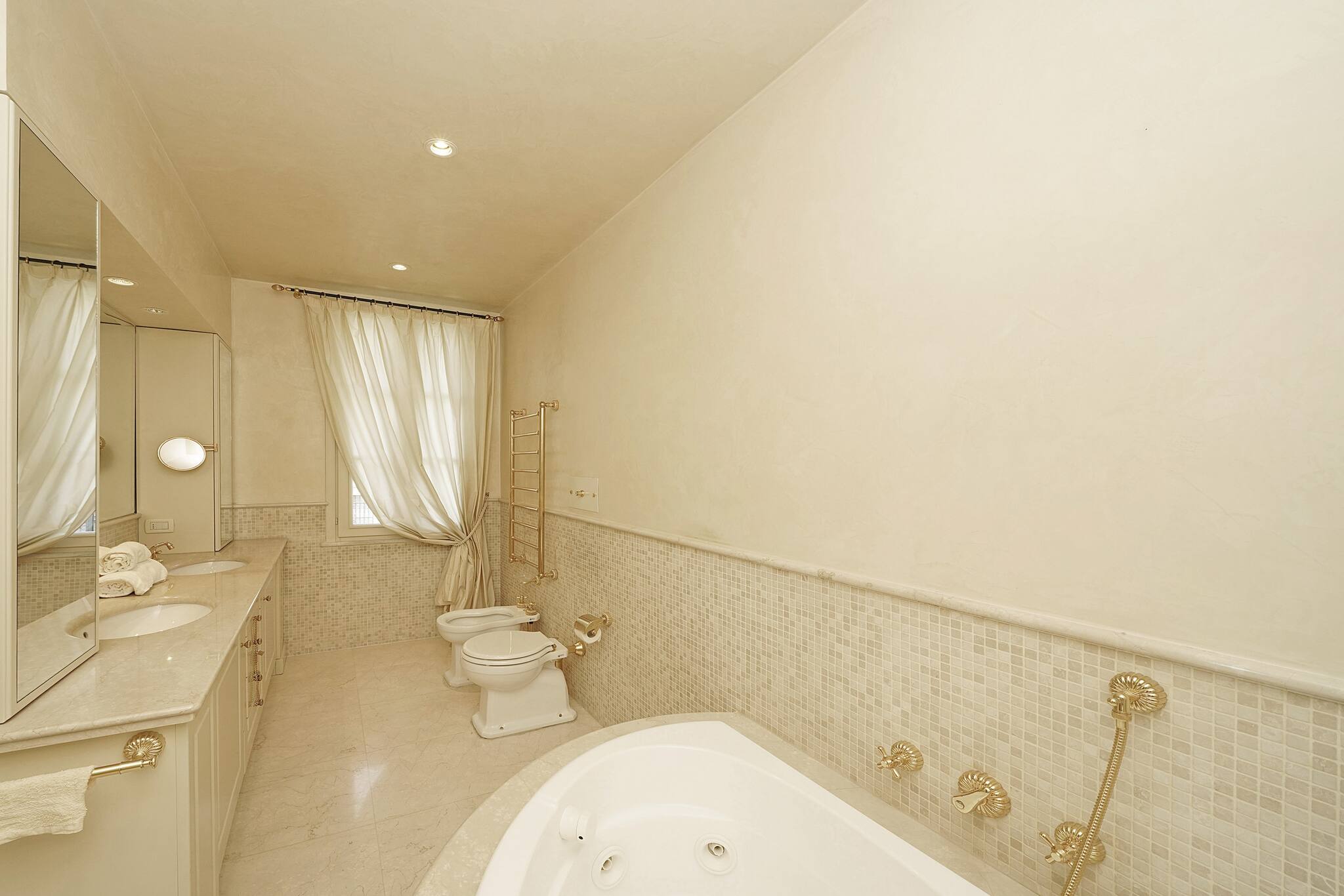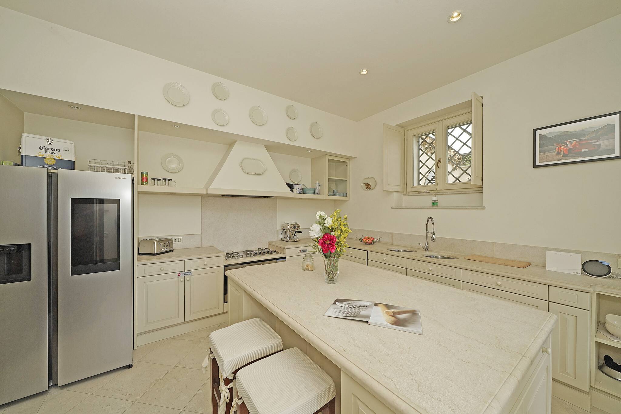 Going down the stairs, you access the actual ground floor with: a large separate kitchen fully equipped with a peninsula: dishwasher, oven, coffee machine, toaster, crockery; from the kitchen you directly access the porch equipped with dining table and chairs and the private swimming pool. Next to it, a small outdoor kitchen. On this same floor is the third separate bathroom with double washbasin, shower, toilet and bidet with a window door overlooking the garden. Continuing, you access a laundry area with washing machine. The villa then continues with an annex with air conditioning, connected but separate in spaces: it consists of a double bedroom, a private bathroom with toilet, bidet and double shower and a 2nd kitchen fully equipped with: oven, microwave, toaster, blender and professional bar coffee machine. Media: smart TV WiFi: included. 2 External private parking spaces within the property. EXTRA SERVICES: private chef on request for a fee