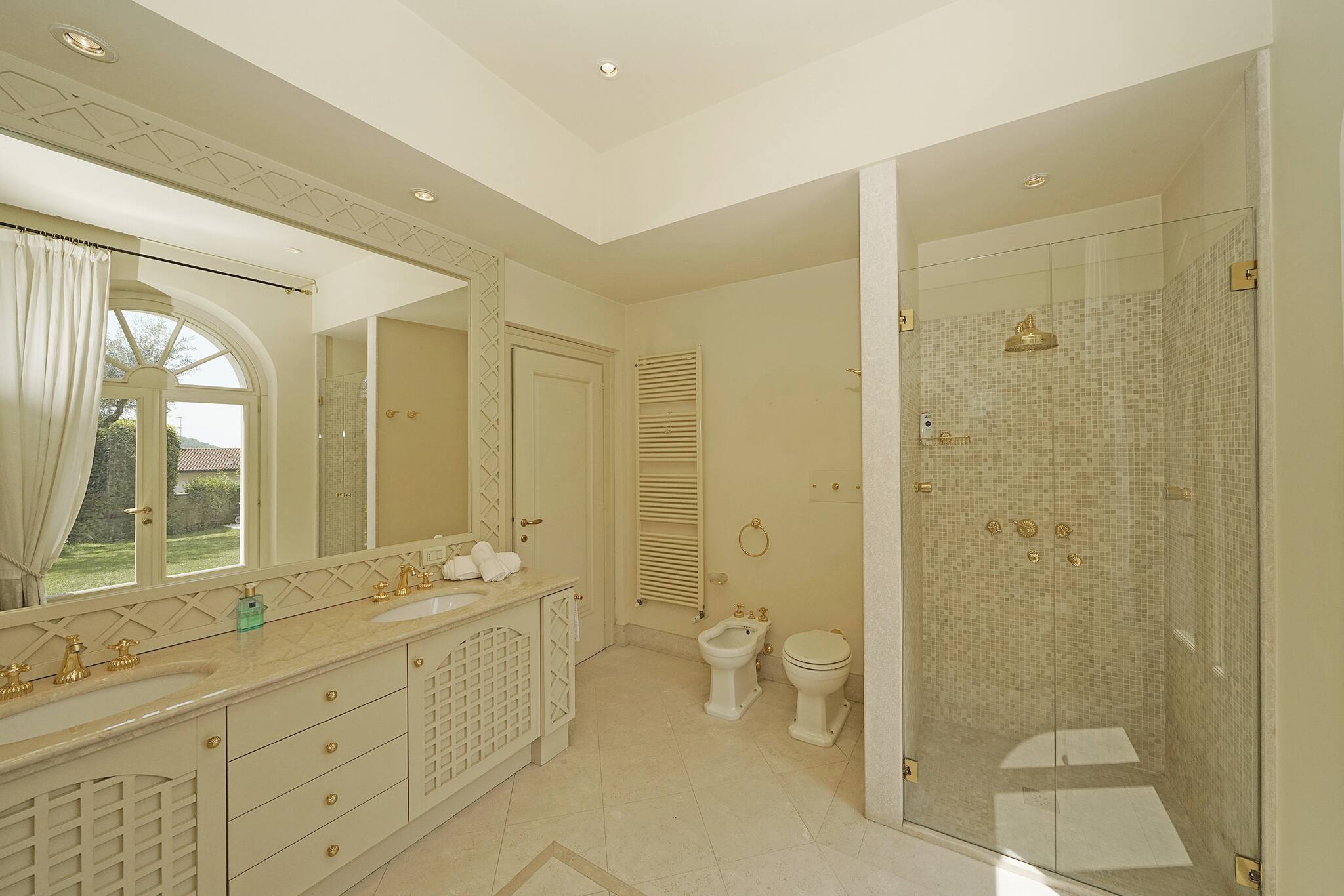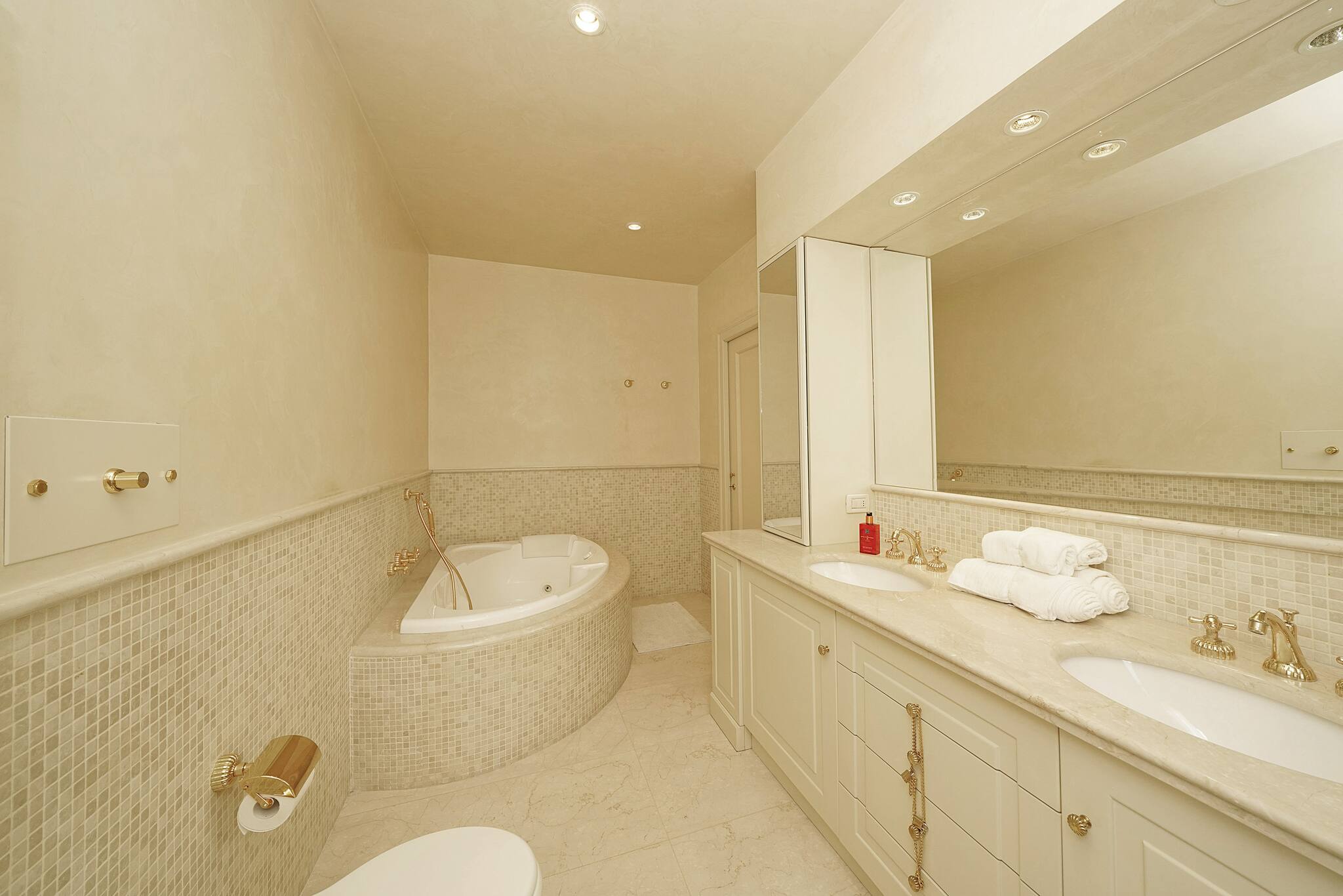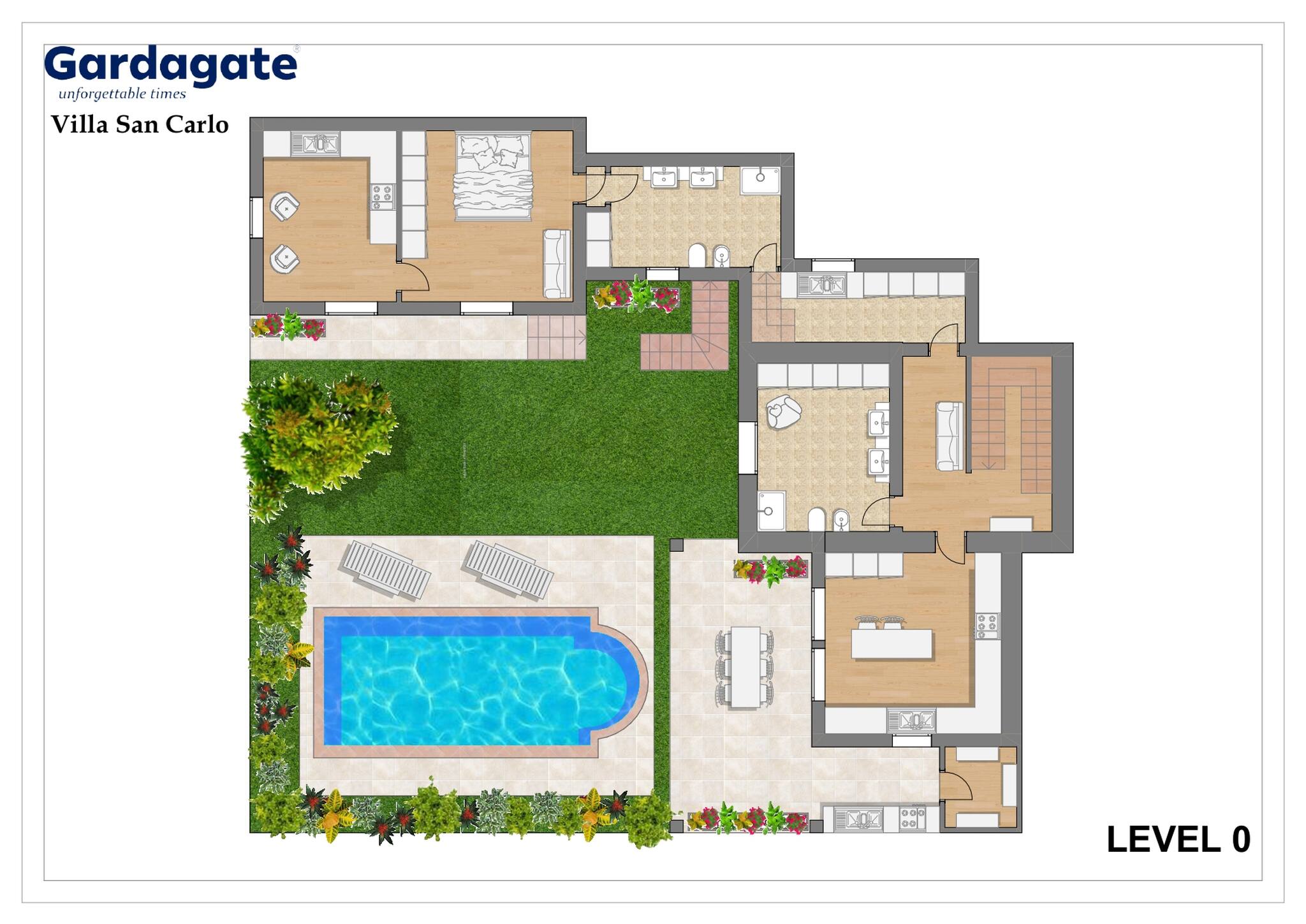 Villa arranged on three levels: access floor with atrium and French window with balcony overlooking the pool and lake; living room with 2 two-seater sofas. Going up the stairs, you will find: master bedroom with double bed, air conditioning, walk-in wardrobe and private bathroom with double washbasin, toilet, bidet and whirlpool bath; 2nd bedroom with single bed and bathroom with toilet, bidet and shower all in one environment; 3rd bedroom with double sofa bed.